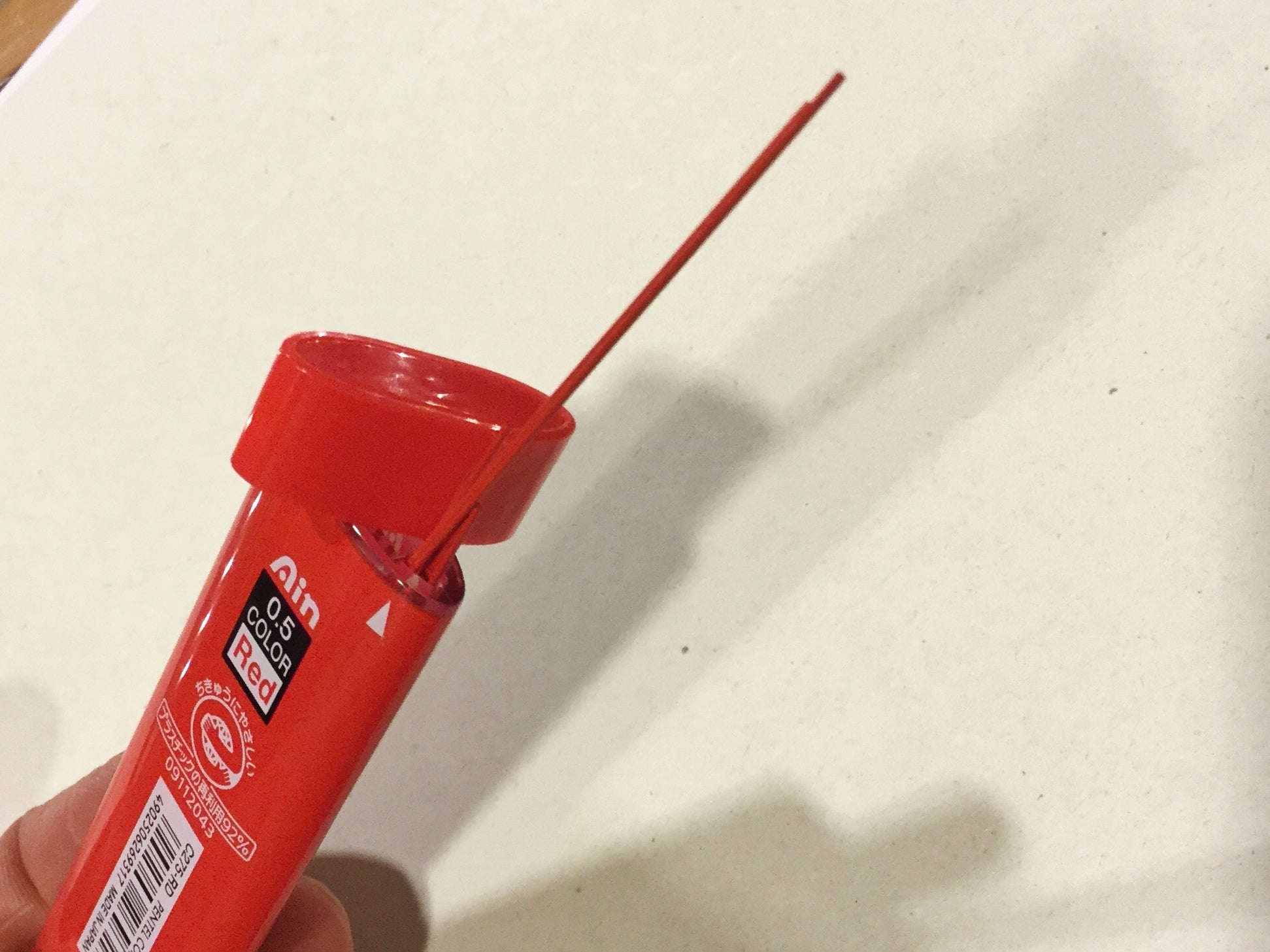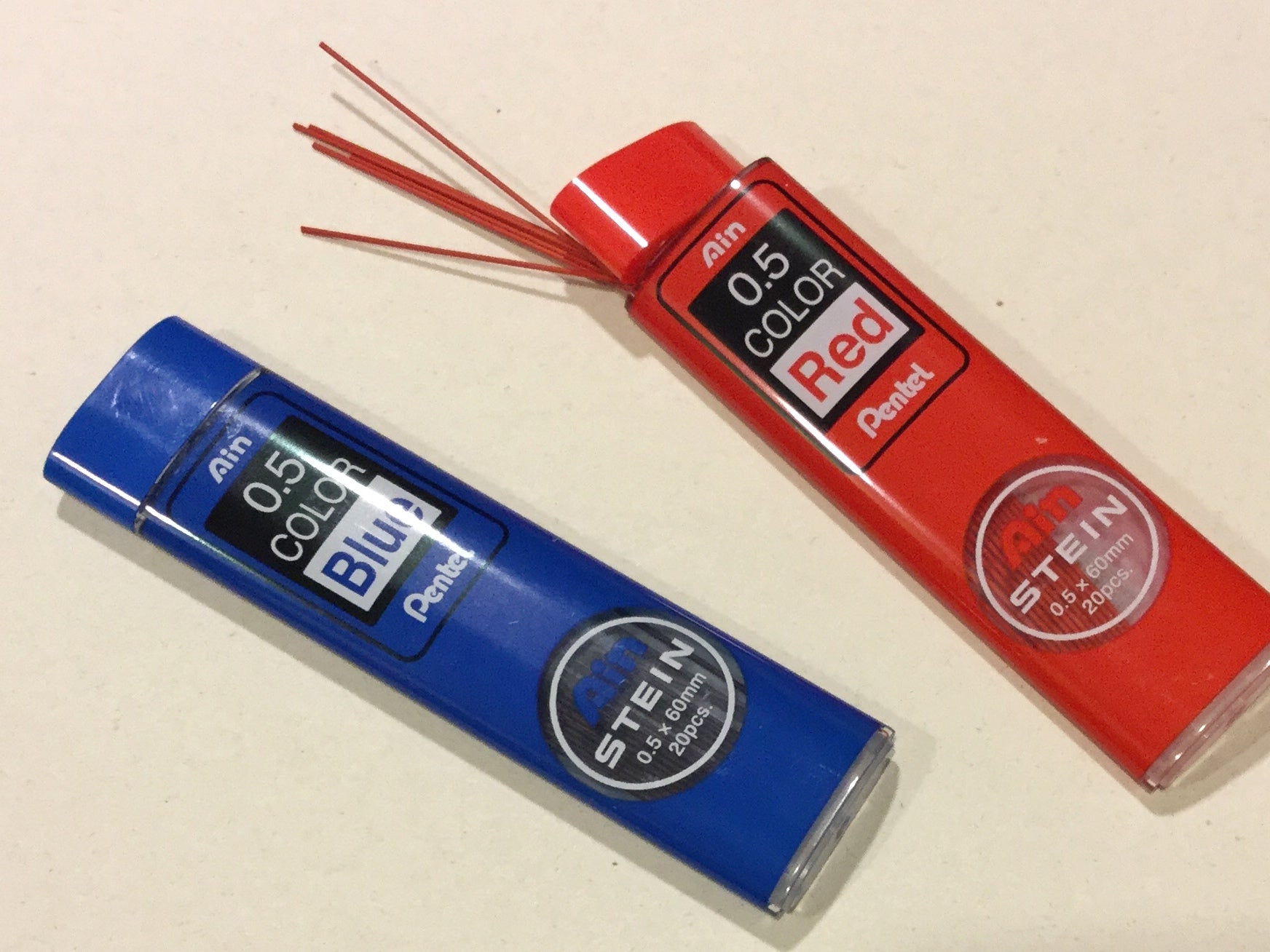 In Druckbleistifte lassen sich auch Farbminen an Stelle von Grafitminen einfüllen. Zum Beispiel diese stabilen roten oder blauen Minen von Pentel. Mal was anderes. Ersetzt einen feinen Buntstift und ist nachhaltiger, weil man die Minen immer wieder ersetzen kann.