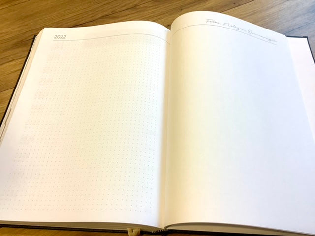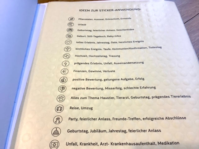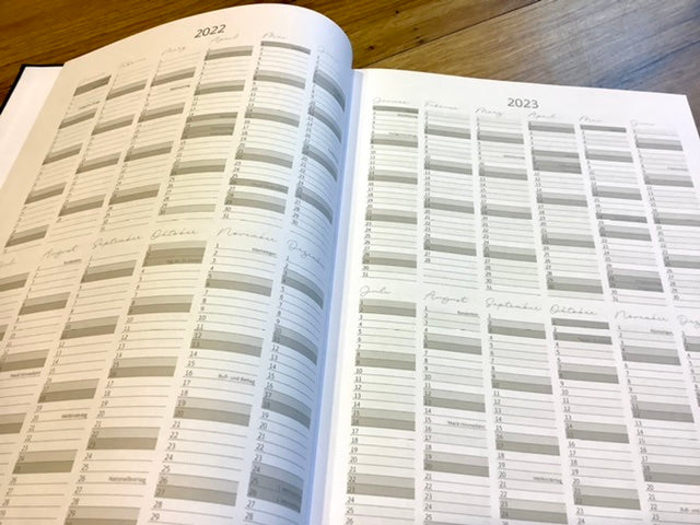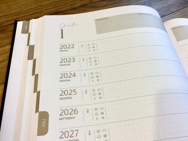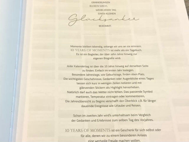 - mit 24 Seiten für Zusatztexte oder zum Einkleben von Bildern, Tickets o. ä. (2 Seiten pro Jahr)