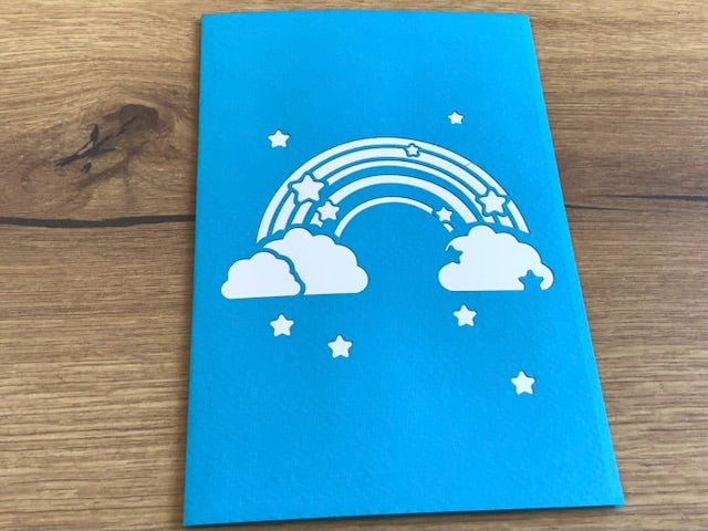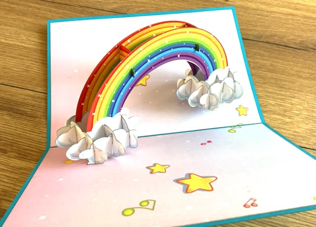 eine dreidimensionale Pop-up-Karte, aus der sich beim Öffnen Geburtstagstörtchen und Ballons aus feinem Papier entfaltet.