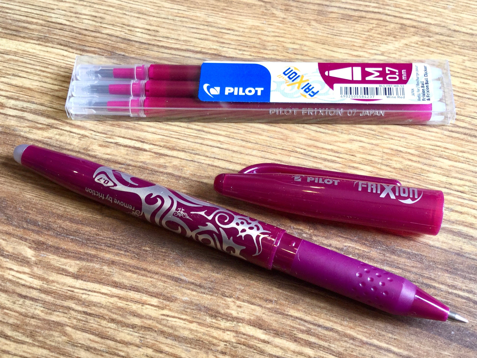 - die wärmeempfindliche Tinte ist mit der Kappenspitze wegradierbar (durch die Reibungswärme)