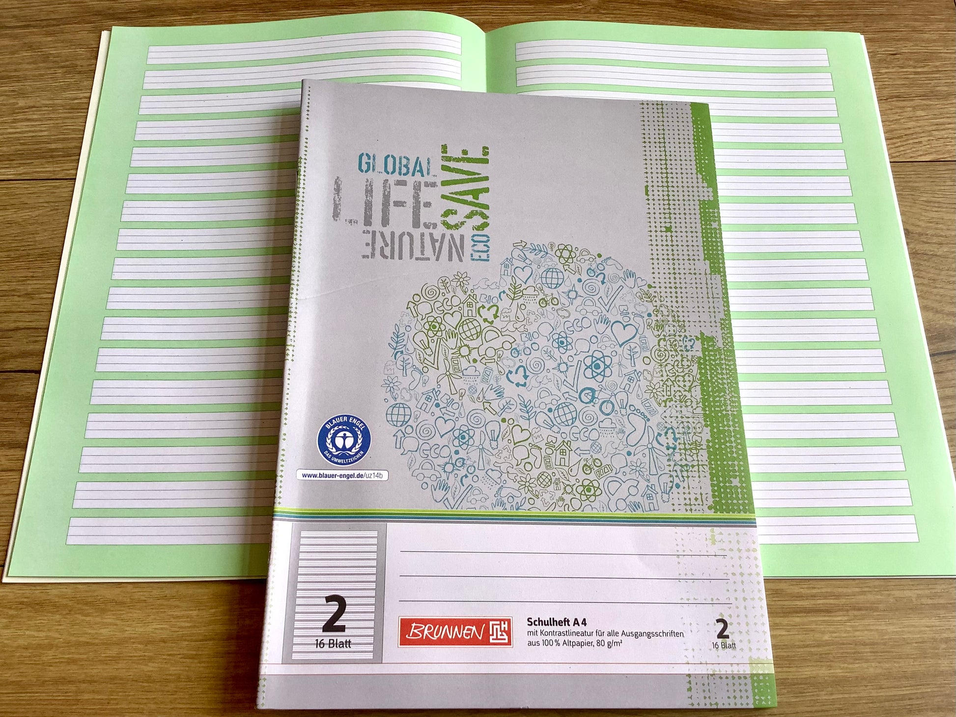 Umweltfreundliches Schulheft zum Schreibenlernen fürs erste Schuljahr, Lineatur 1.