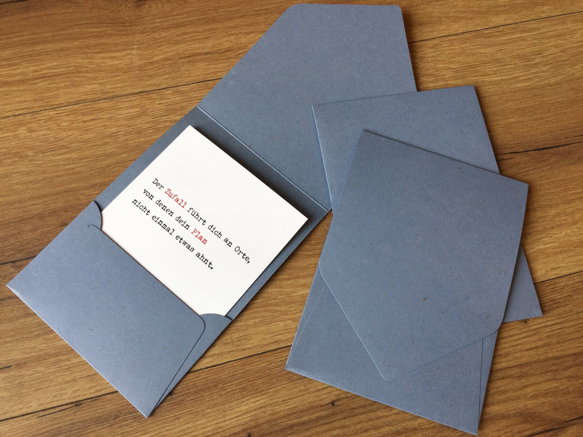 Edler Briefumschlag in Taschenform aus 240g-schweren Naturpapier in der Farbe Denim (graublau).