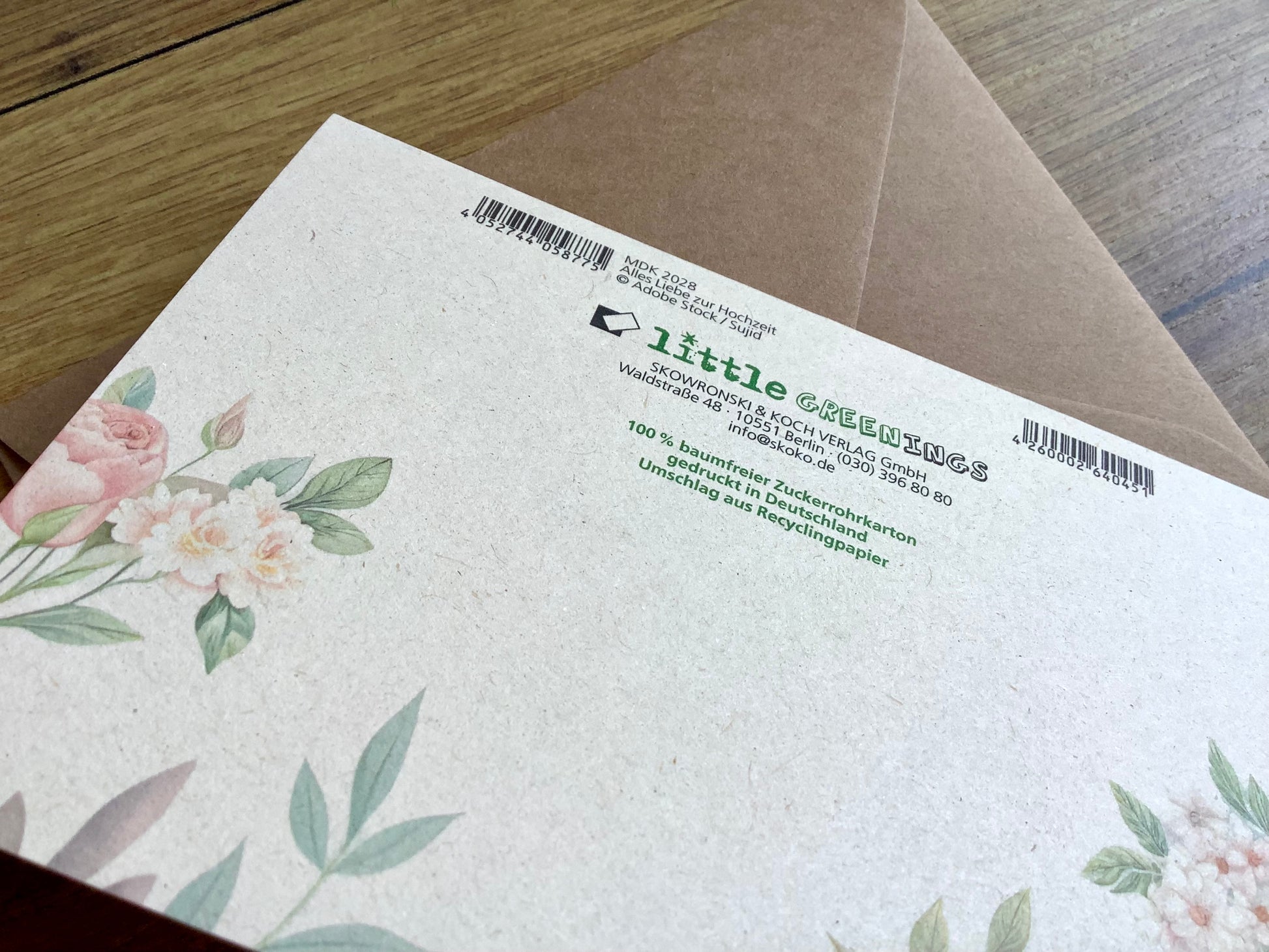 - in Deutschland auf FSC-Mix-Papier gedruckt (100 % baumfrei, das Kartenpapier wird aus Resten der Zuckerrohrproduktion gemacht, die Kuverts aus Recyclingpapier)