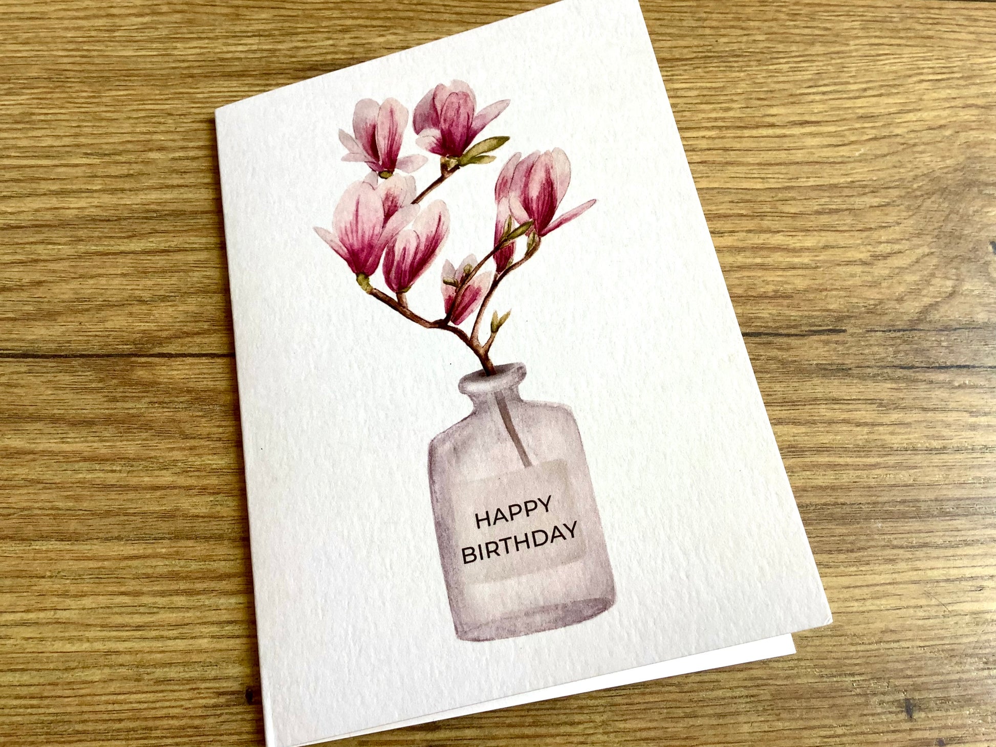 Gedruckt auf hochwertigem 300g-Recyclingkarton von Gmund, leicht strukturiert, schöne Haptik. Dabei ist ein passender C6-Briefumschlag aus Graspapier.
