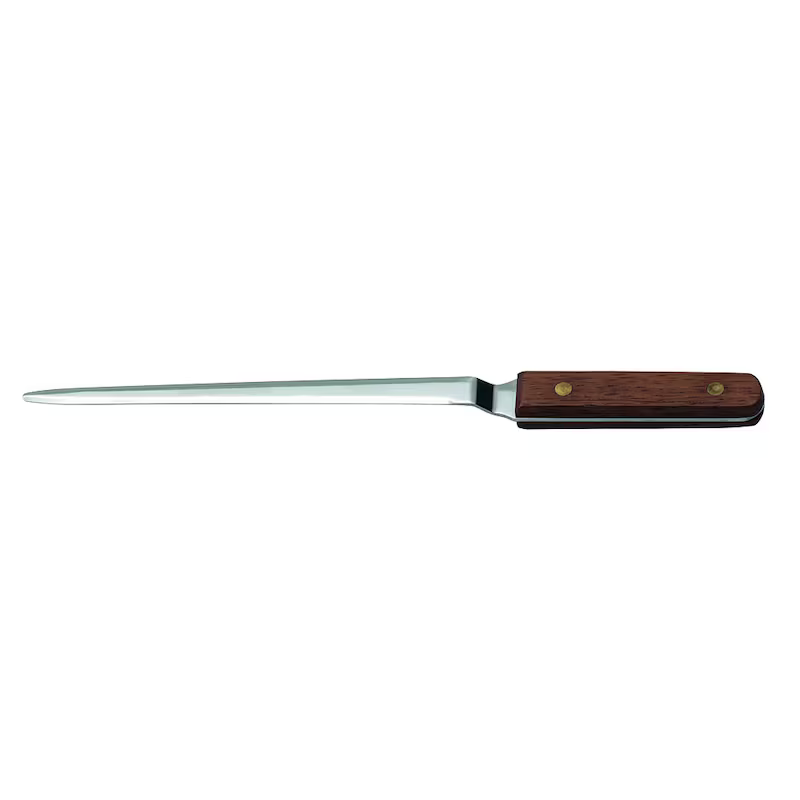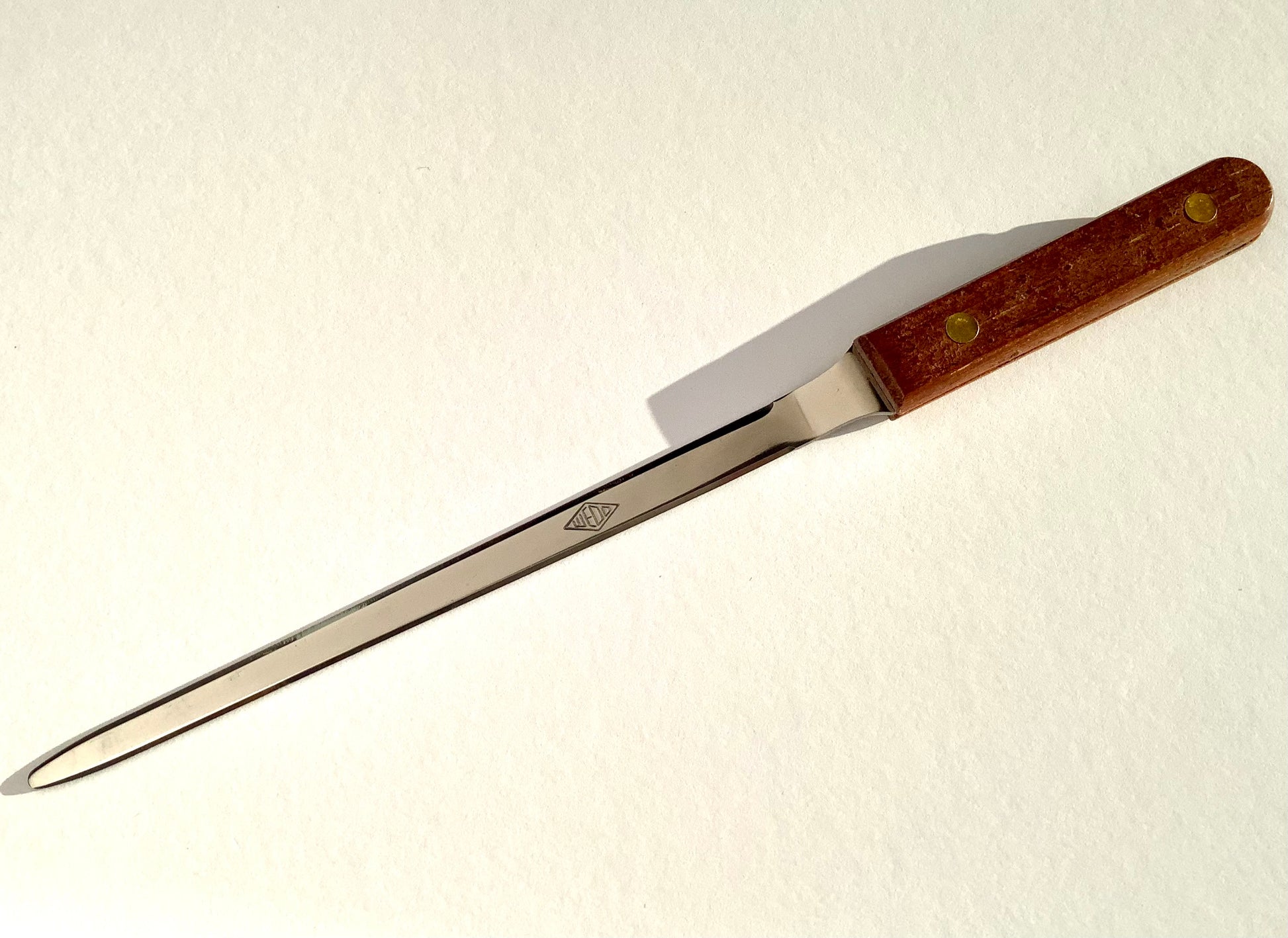 Die in Holz eingefasste 12,4 cm lange Edelstahlklinge gleitet dank der leichten Kante vor dem Griff wie Butter durch jeden Briefumschlag.