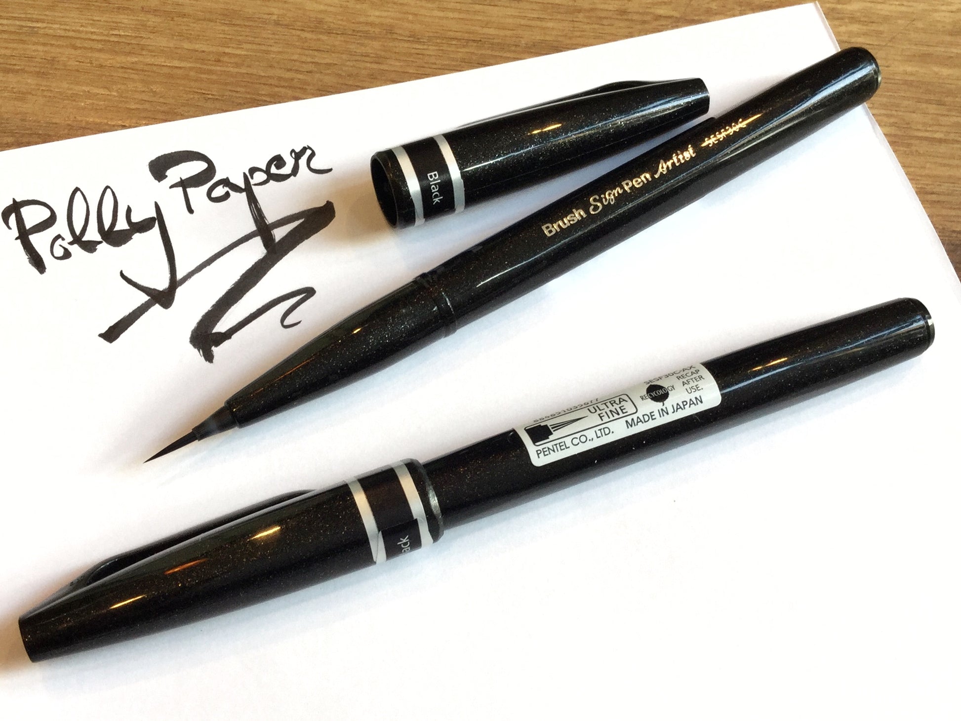 Der Brush Sign Pen „Artist“ von Pentel hat eine lange flexible Spitze aus Acryl für Handlettering oder Kalligrafie mit Tinte auf Wasserbasis.