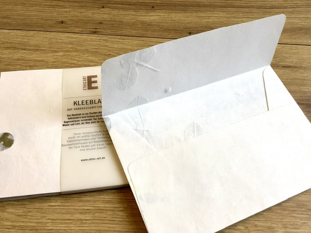 10 Umschläge im C6-Format aus handgeschöpftem Papier mit eingelassenen Kleeblättern.