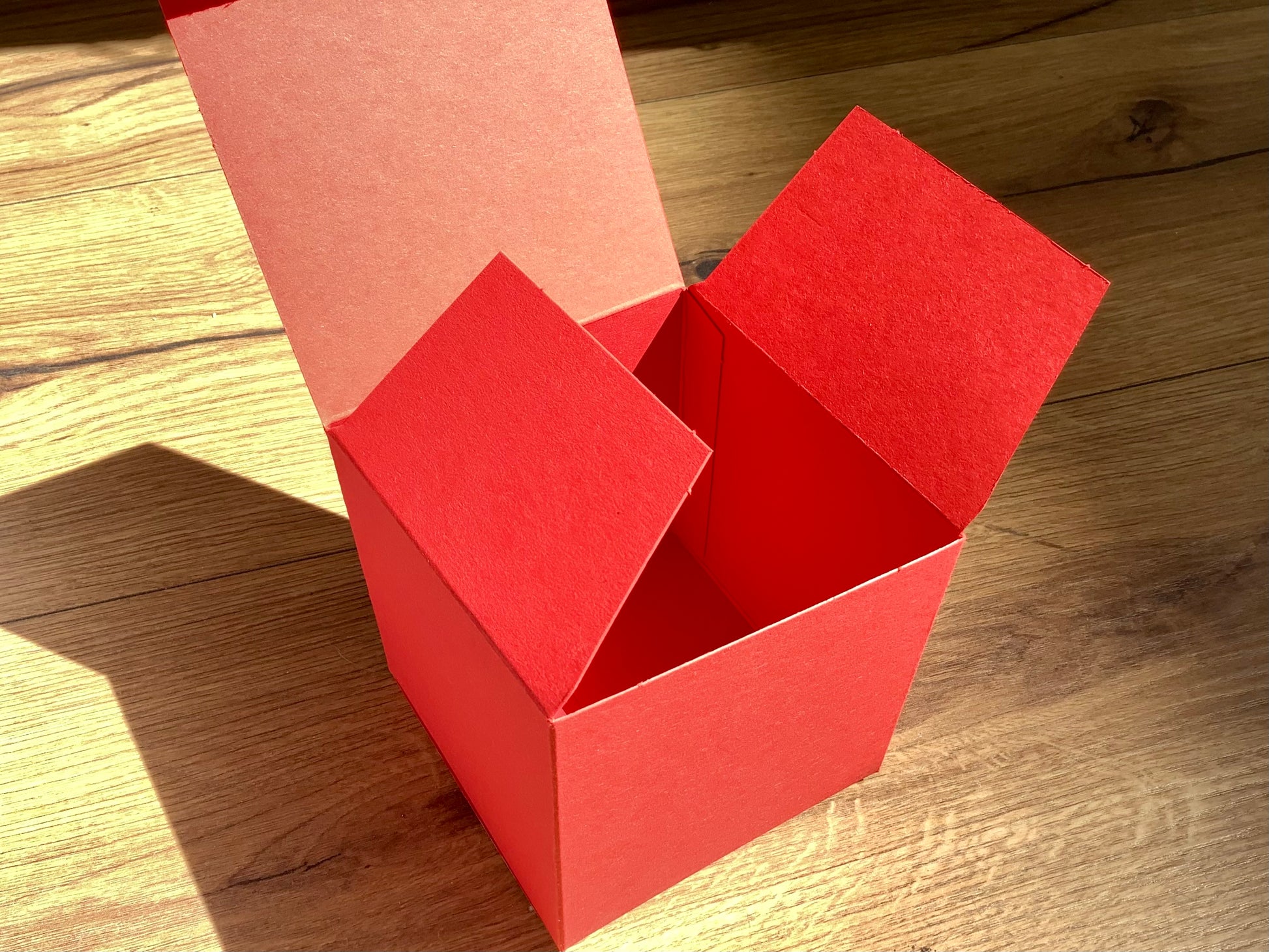 Mit dieser quadratischen Schachtel kannst Du in Sekundenschnelle ein Geschenk hübsch verpacken. Schleife drum, fertig. Sie lässt sich auch gut bemalen, mit washi tape bekleben oder mit Stempeln dekorieren (am besten im flachen Zustand).