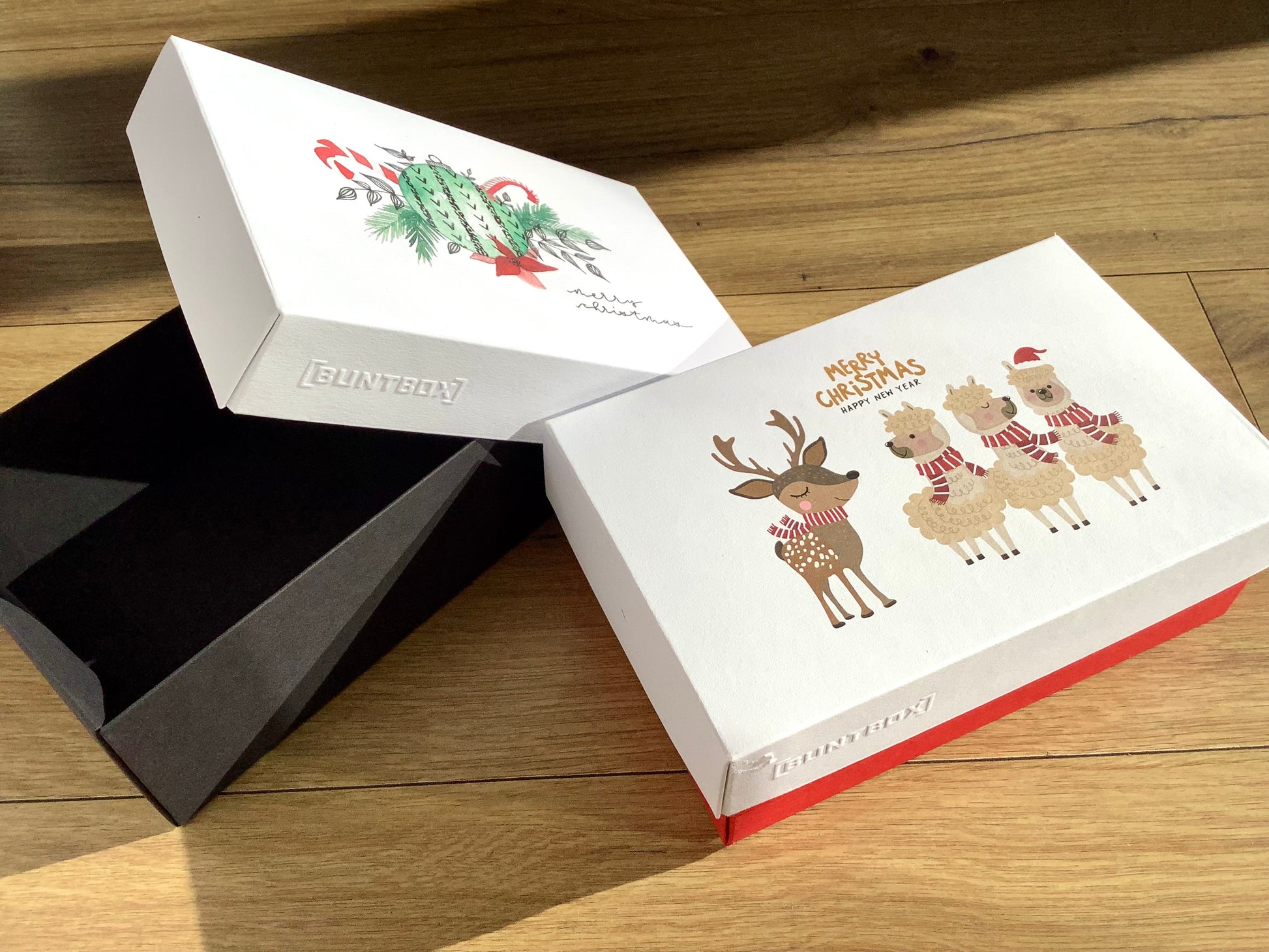 - Deckel weiß mit Weihnachtsmotiv, Unterteil schwarz oder rot (Rentier mit Schafen)
