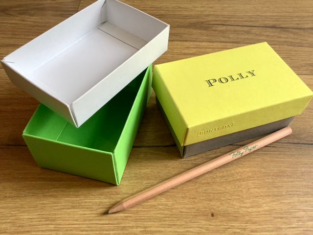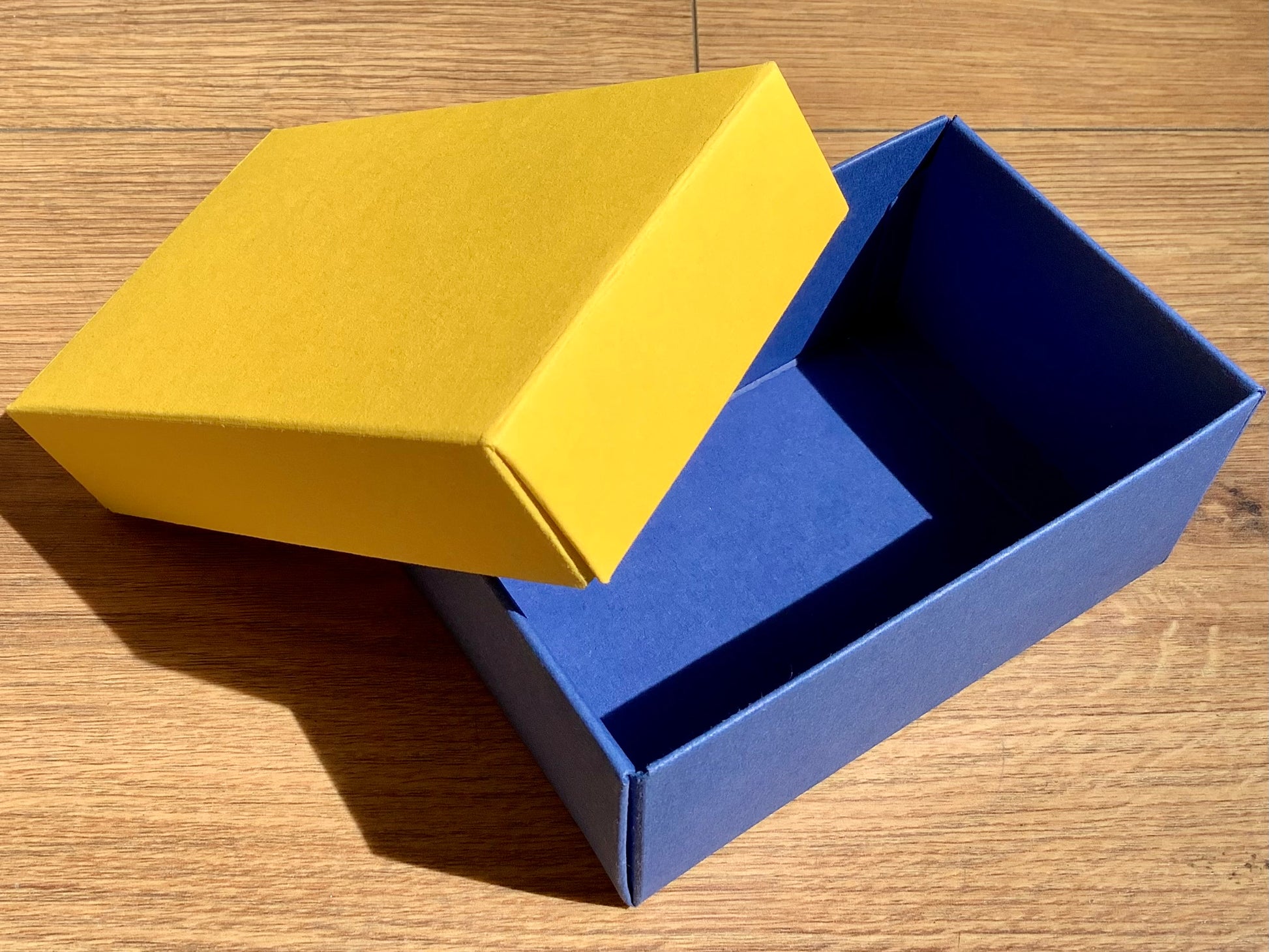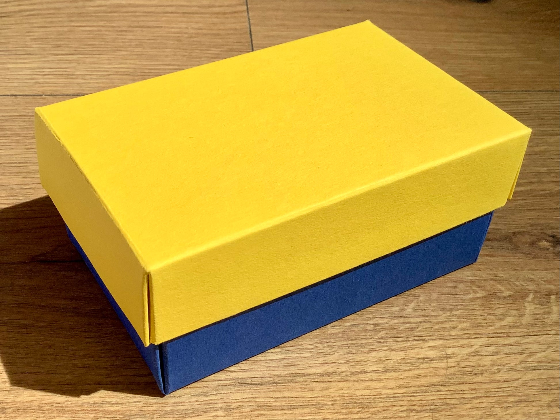 Der umweltfreundliche Mini-Geschenkkarton BUNTBOX S in Farben, die miteinander kombiniert werden können (zum Beispiel unten blau, Deckel in gelb).