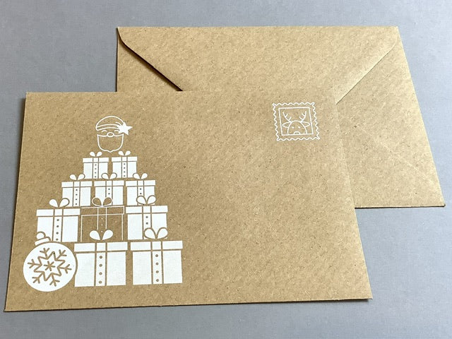 naturbrauner Briefumschlag aus festem rauen Recyclingpapier mit weißem Weihnachtsaufdruck