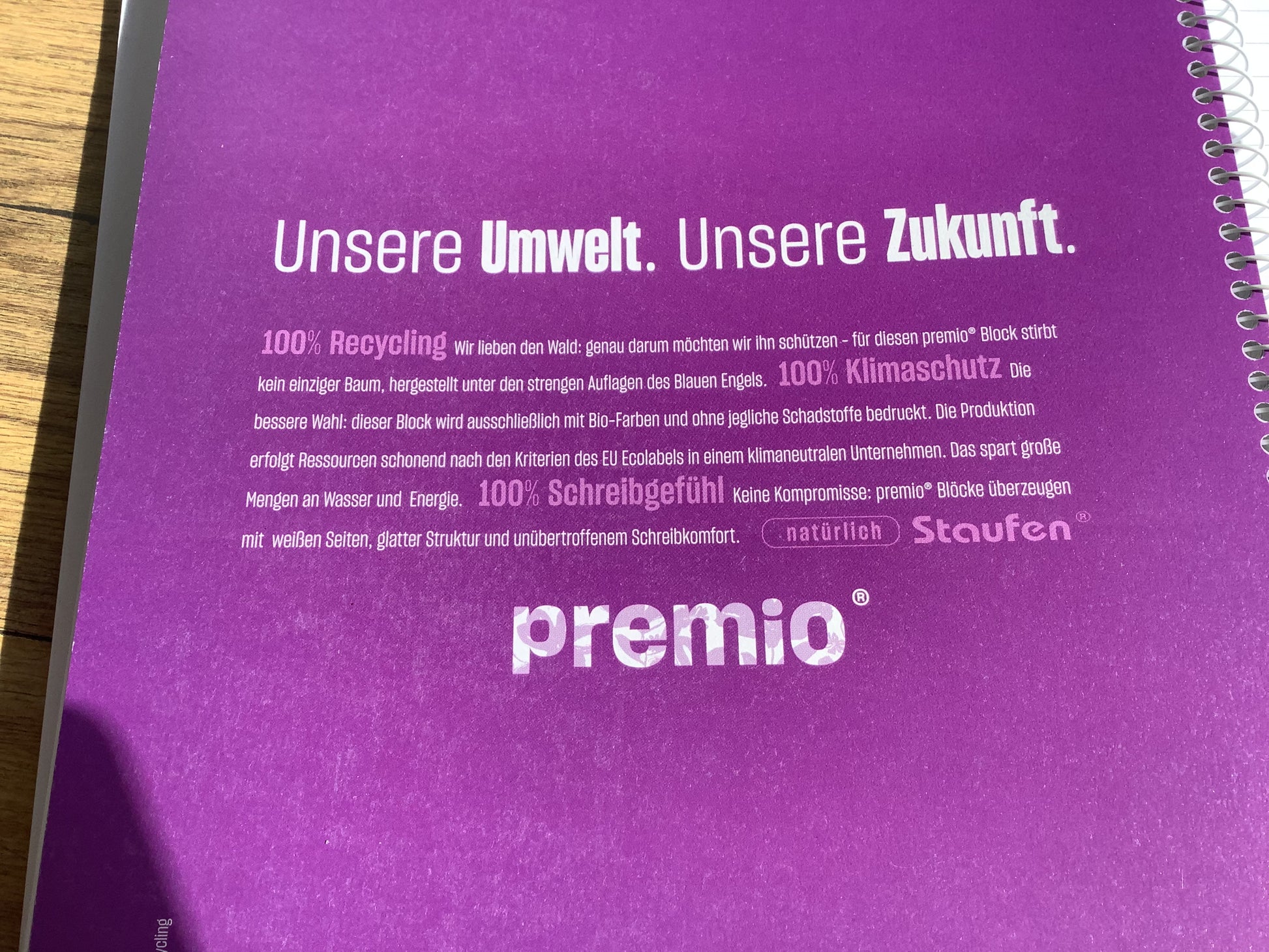 "premio" ist die ökologische Premium-Reihe der Marke Staufen: hochweißes Recyclingpapier mit festen 90 g/m²! Darauf kann man auch mit Tinte gut beidseitig schreiben, ohne dass es durchblutet.