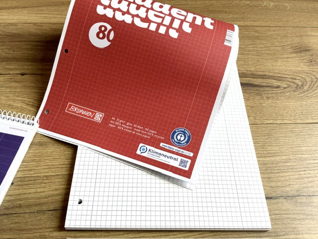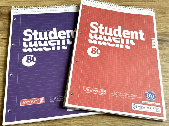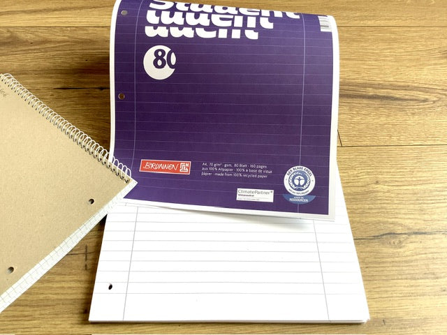 Collegeblock „Student“ mit der Spiralbindung am Kopfende, damit sie Linkshänder*innen nicht unterm Handgelenk stört.