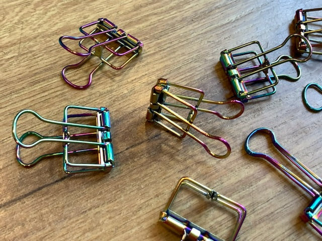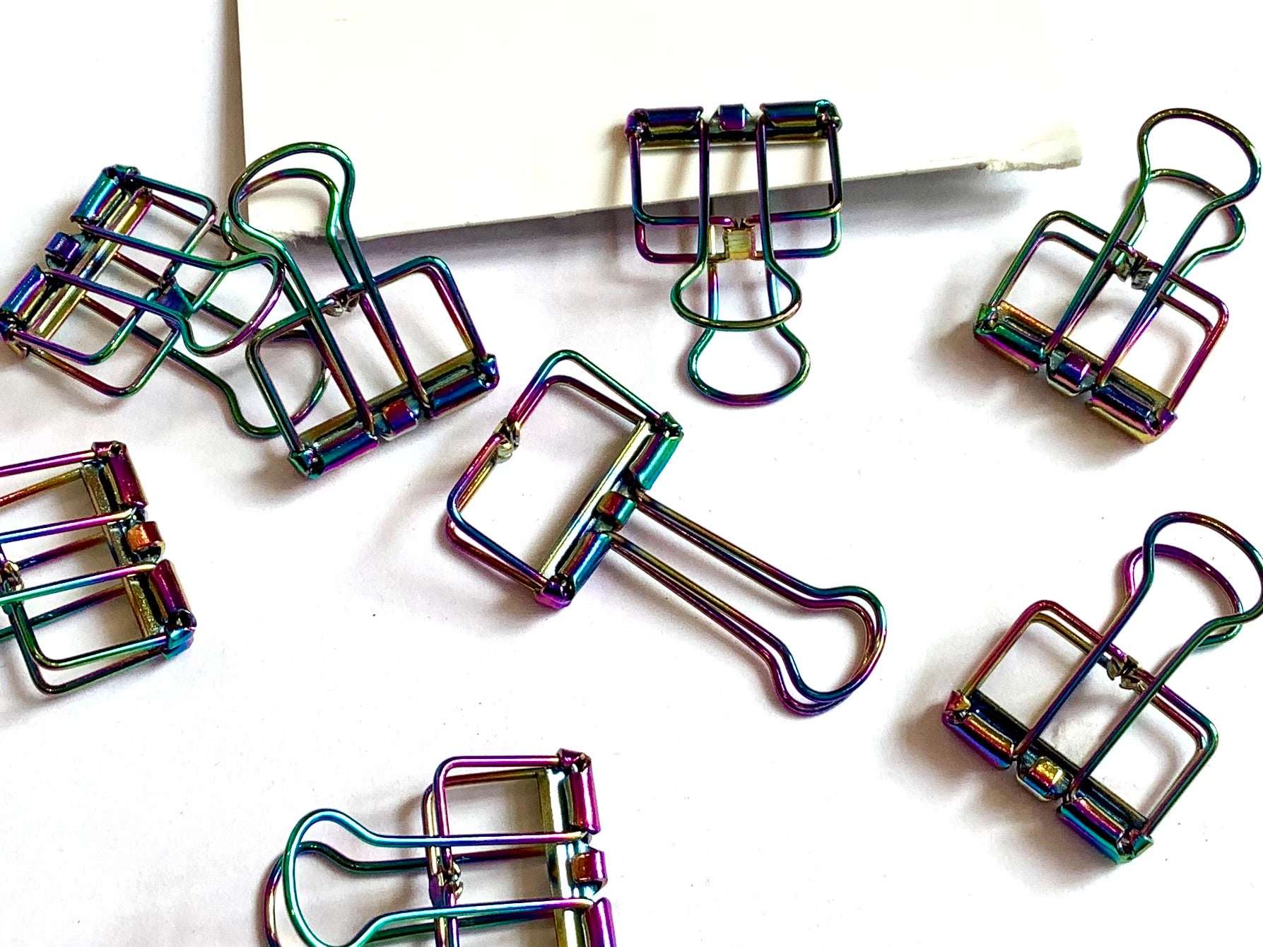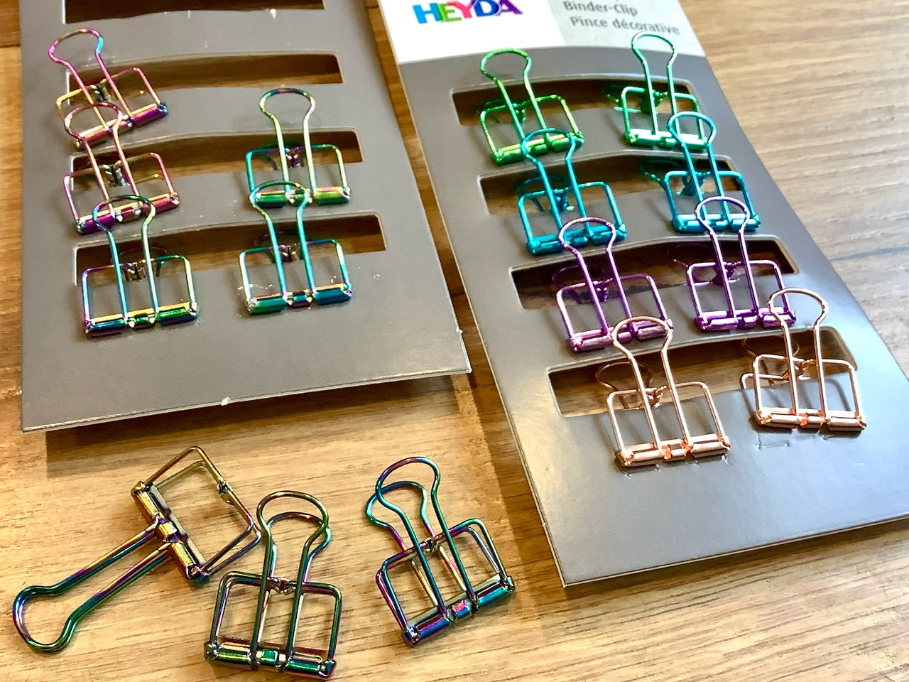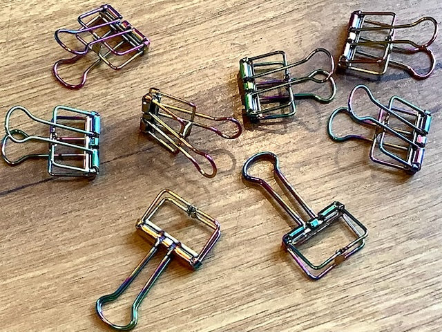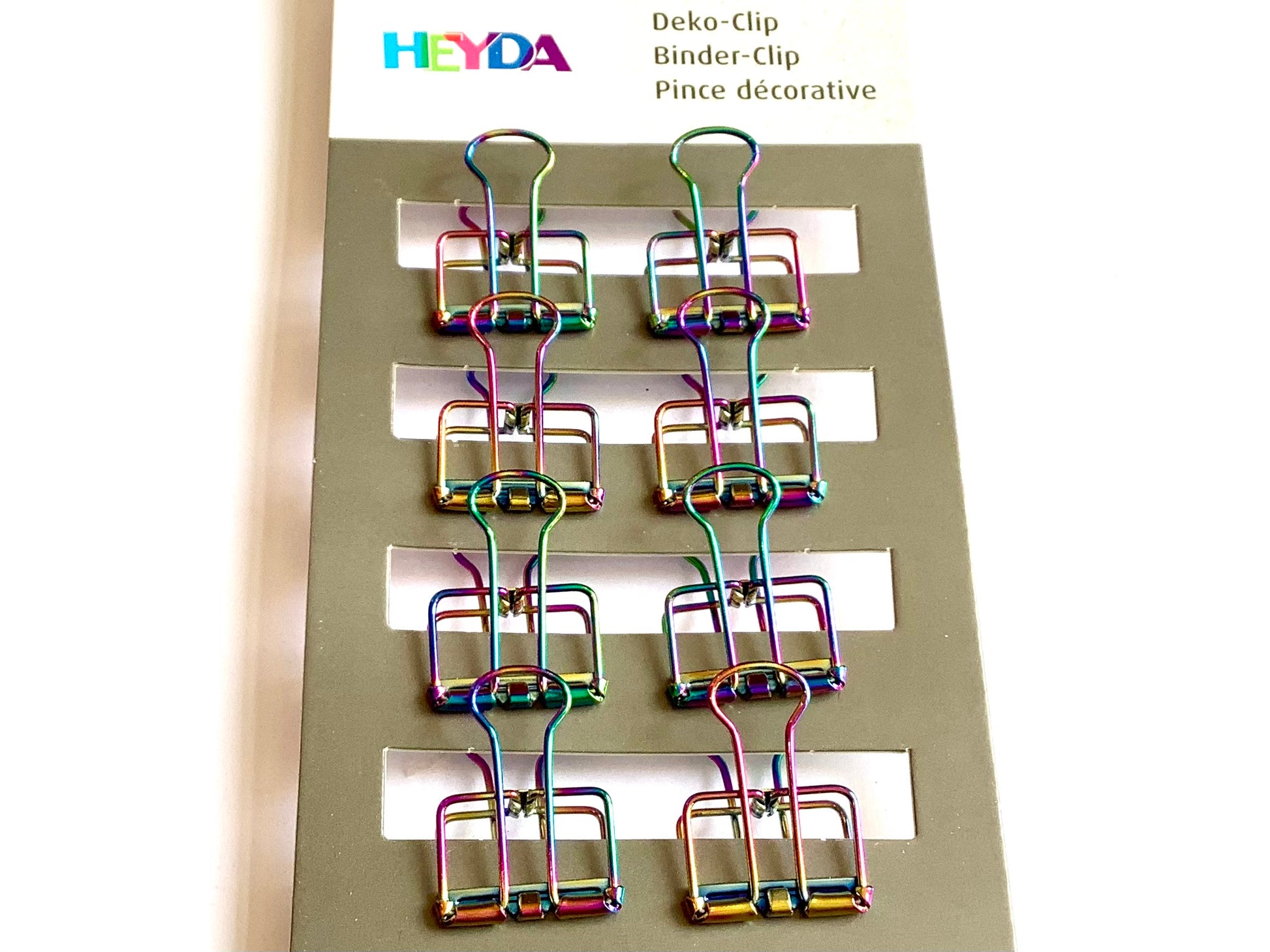 8 bunte Foldback-Clips, mit denen man Zettel zusammenhalten oder auch Bilder aufhängen kann. Viele Einsatzmöglichkeiten.