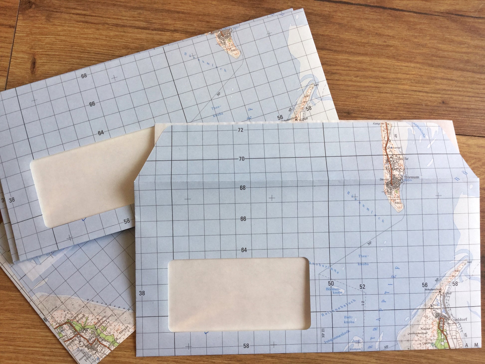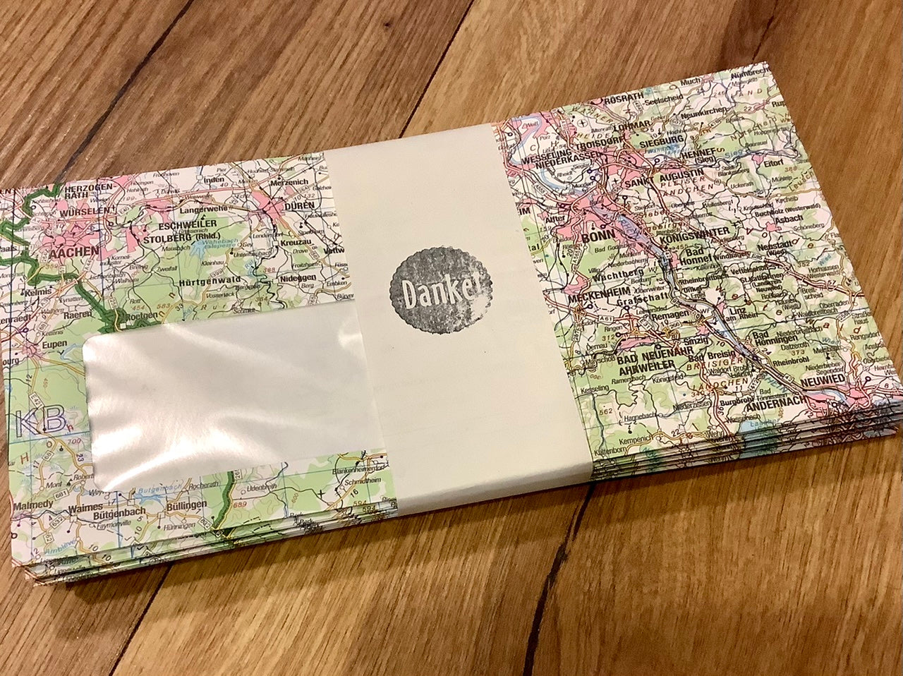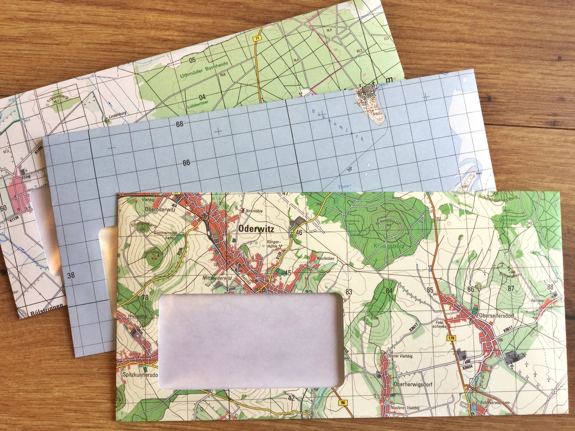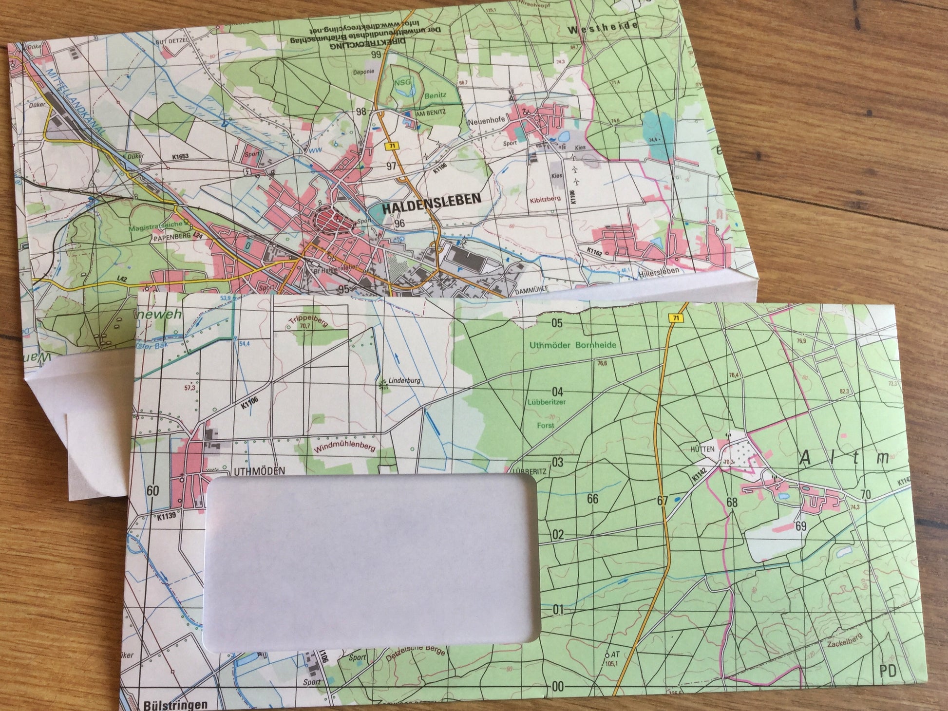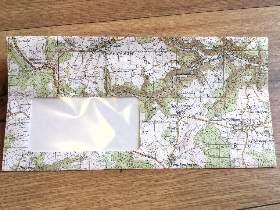 So schön kann Umweltschutz aussehen: "Direktrecycling“ heißen der Hersteller und das innovative Verfahren, bei dem der Rohstoff Altpapier sofort zu neuen Produkten verarbeitet wird. Die hochwertigen Briefumschläge und Versandhüllen waren einmal Landkarten – von Landesvermessungsämtern, der Bundeswehr und anderen Karten-Herausgebern. Material, das nicht mehr gebraucht wurde, weil sich vielleicht ein Detail verändert hat und die Karten neu gedruckt werden mussten. Im Gegensatz zum herkömmlichen Papierrecycling entfällt der Verbrauch von Wasser, Energie und weiteren Aufbereitungsstoffen.