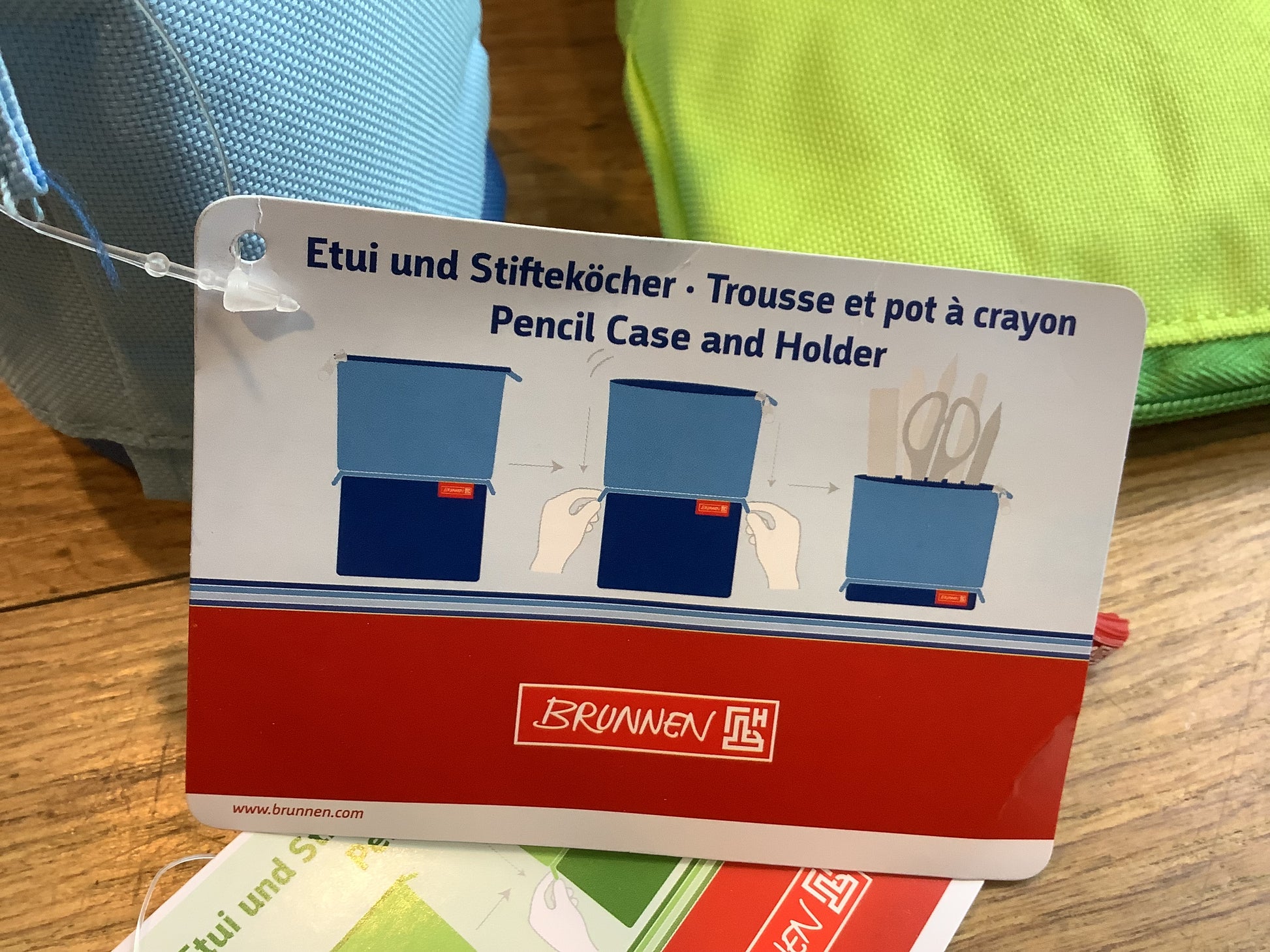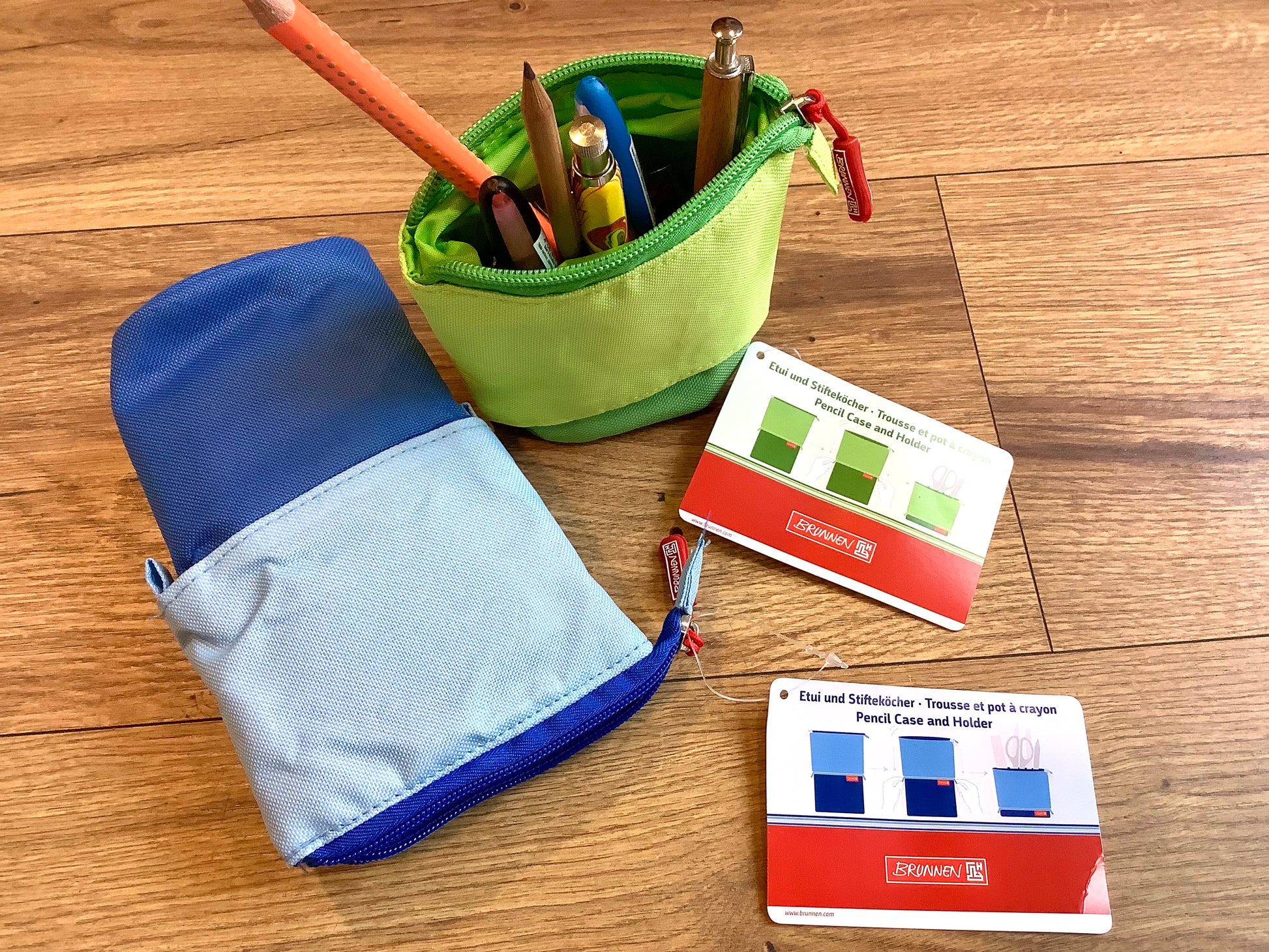 Federmäppchen, das mit einem Griff zum Stifteköcher wird, den man platzsparend auf den Tisch stellen kann.