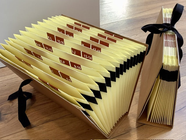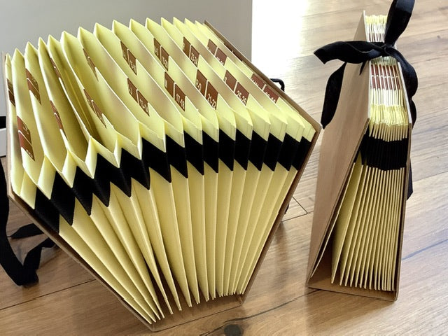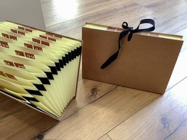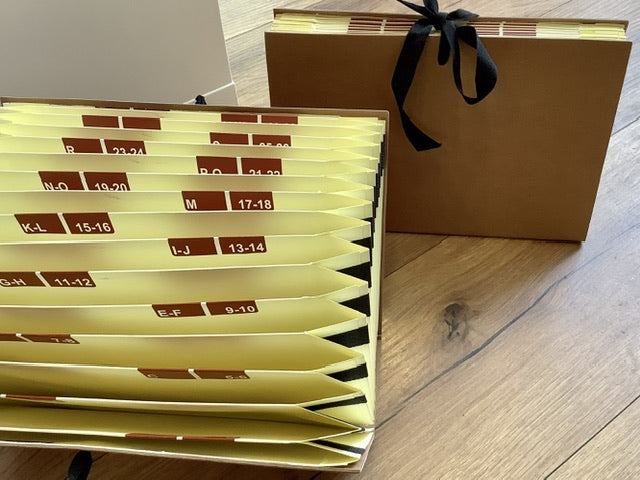 Schöner und stabiler kleiner Fächerordner aus Recyclingkarton mit schwarzem Stoff-Band zum Zuschnüren.