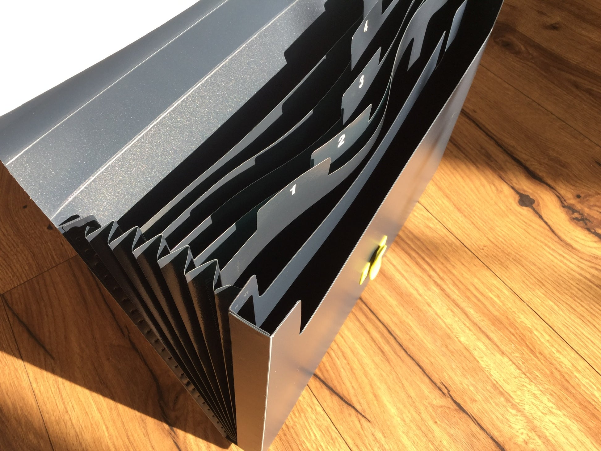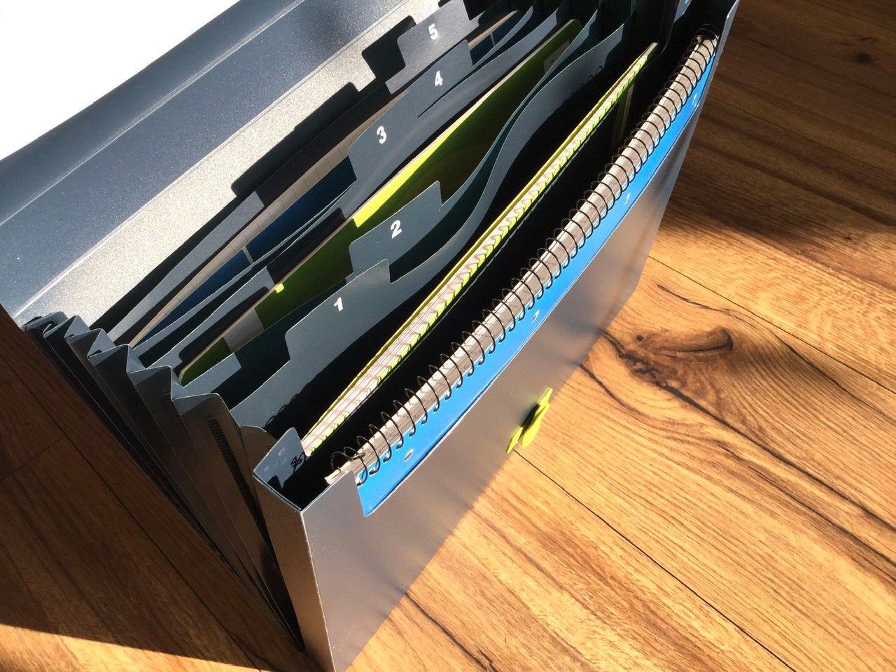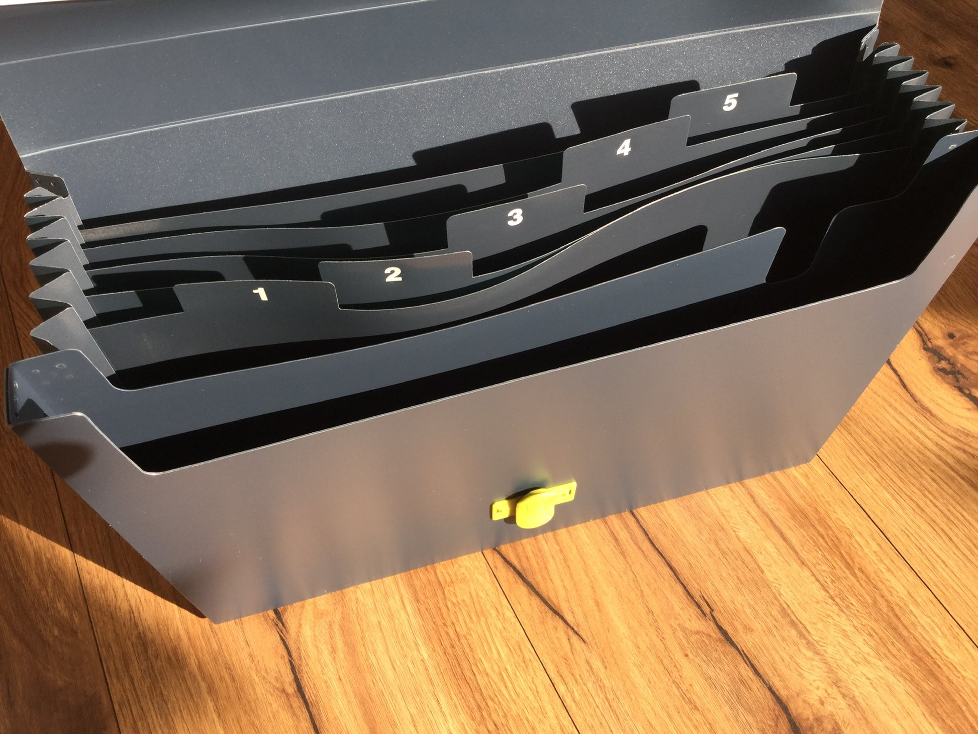 Dunkelblau-graue Ordnungsmappe aus recyceltem Plastik (Polypropylen, PP) mit 5 Fächern.