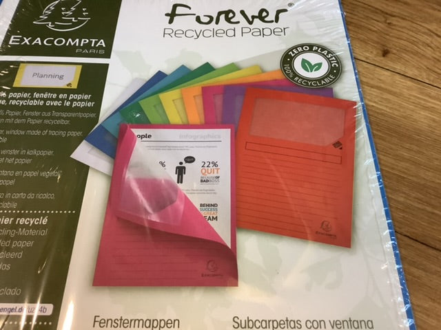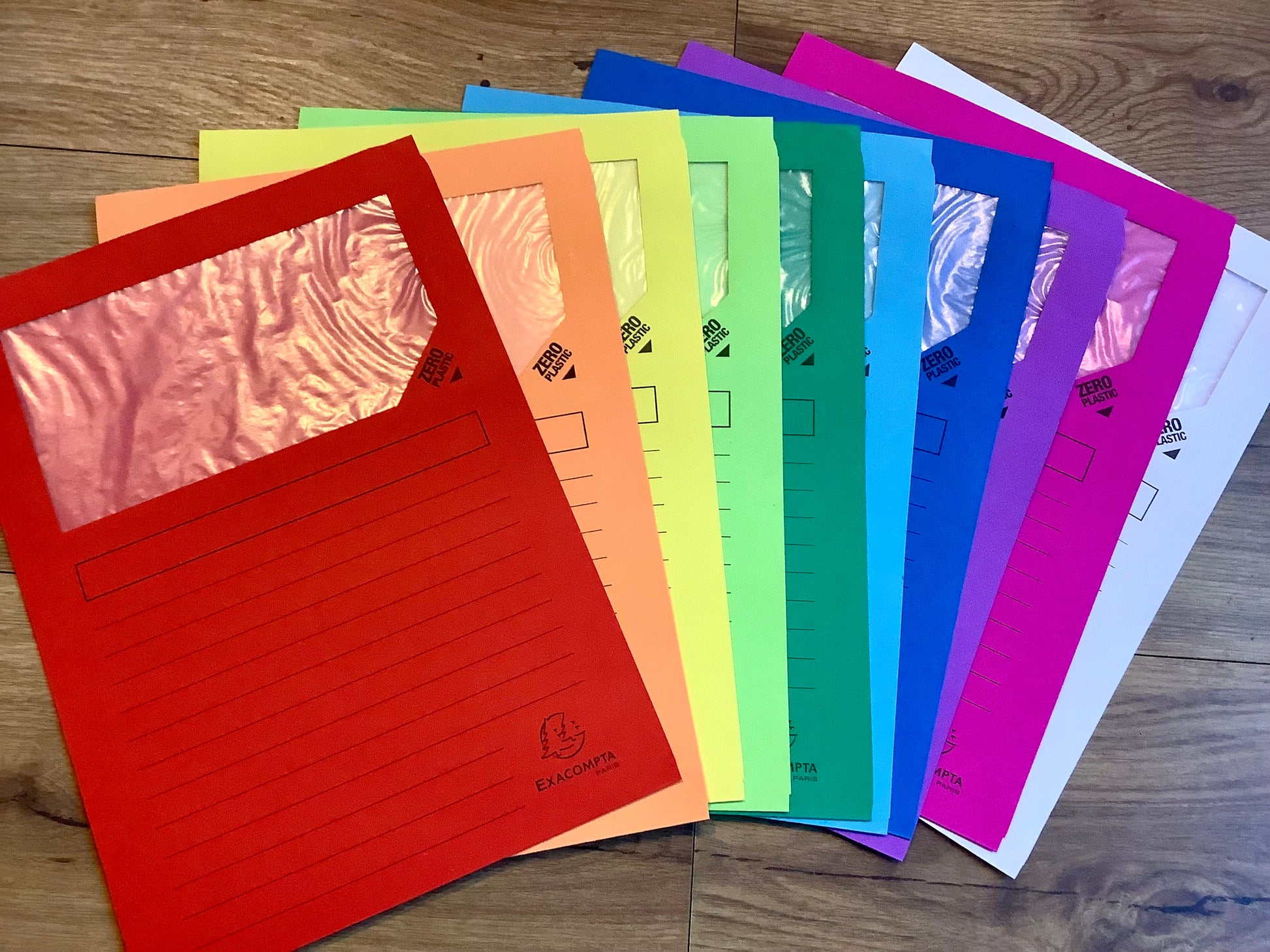 Schön, praktisch und umweltfreundlich: 10 leichte Recyclingpapier-Mappen mit Pergaminfenster, durch die man gleich sieht, was darin liegt.