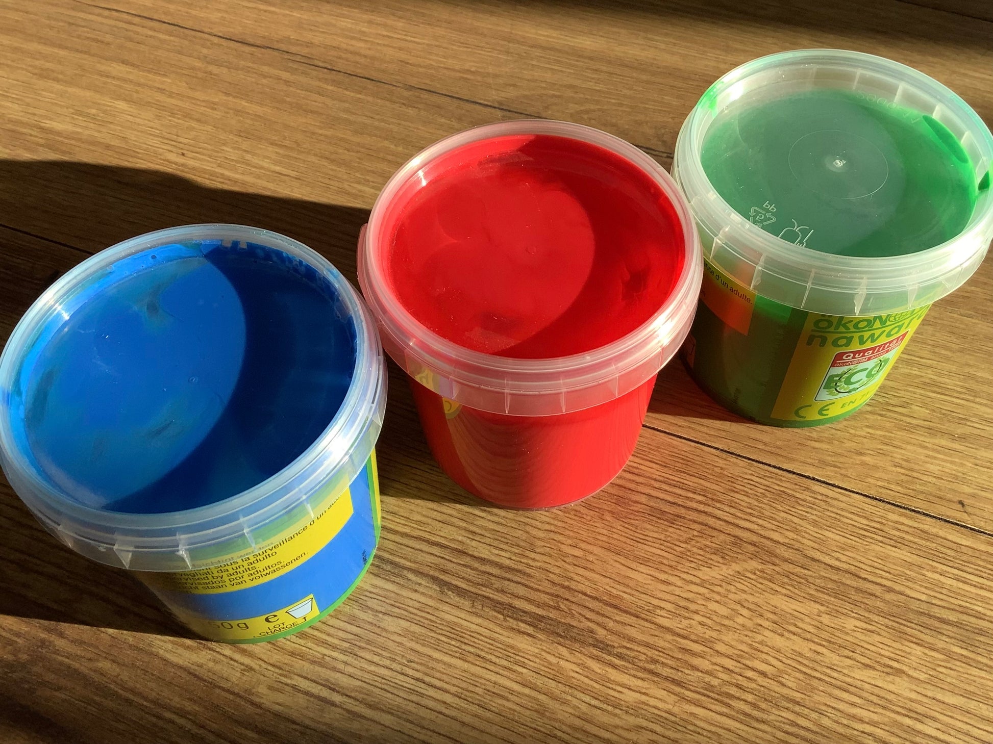 150g-Töpfchen Natur-Fingerfarbe. Mischbar, verdünnbar, wasserlöslich, trocken abreibbar, auswaschbar. Naturfarben, die ökologisch und gesundheitlich absolut unbedenklich sind. Hersteller: ÖkoNORM, Sachsen-Anhalt.