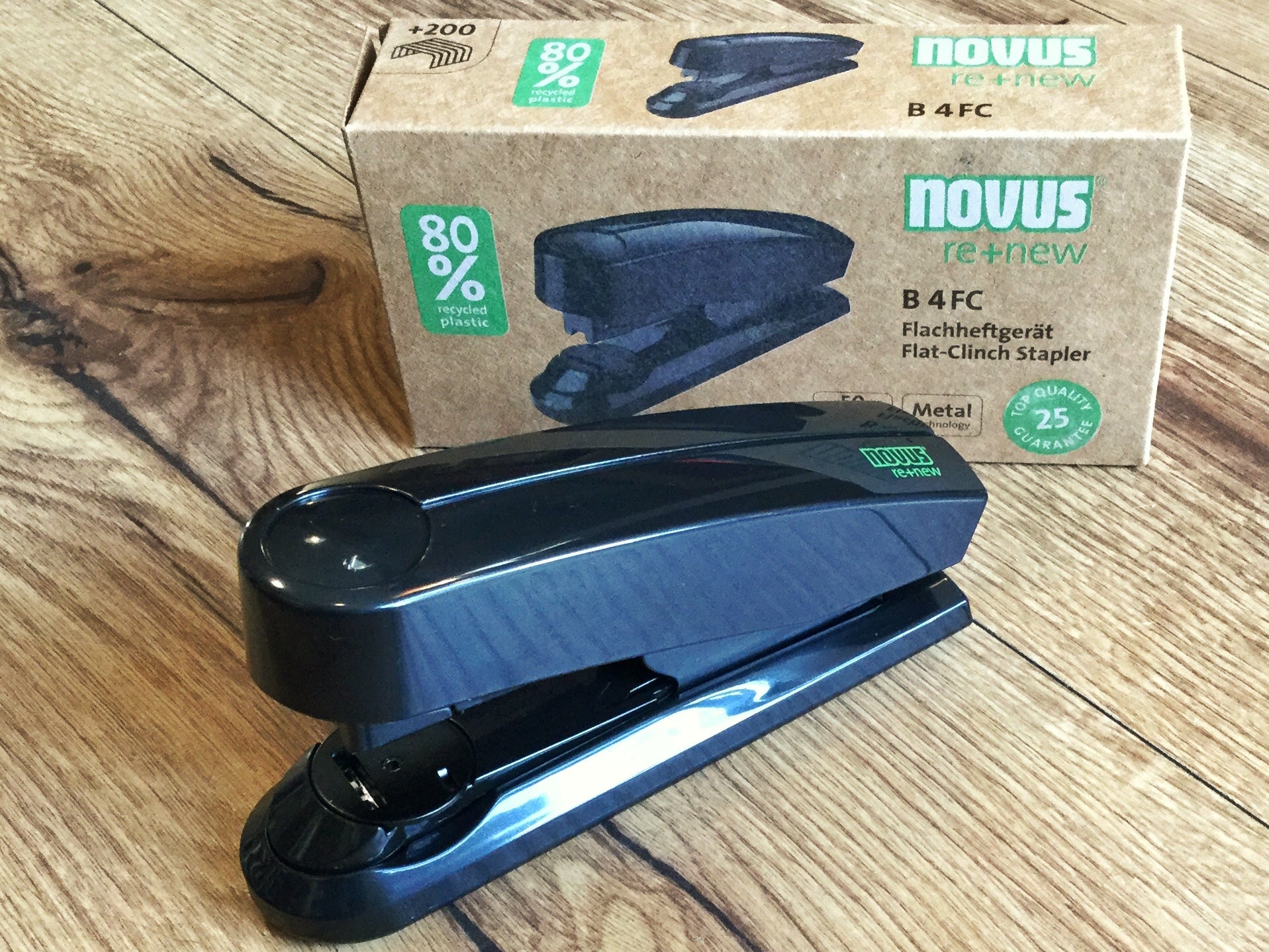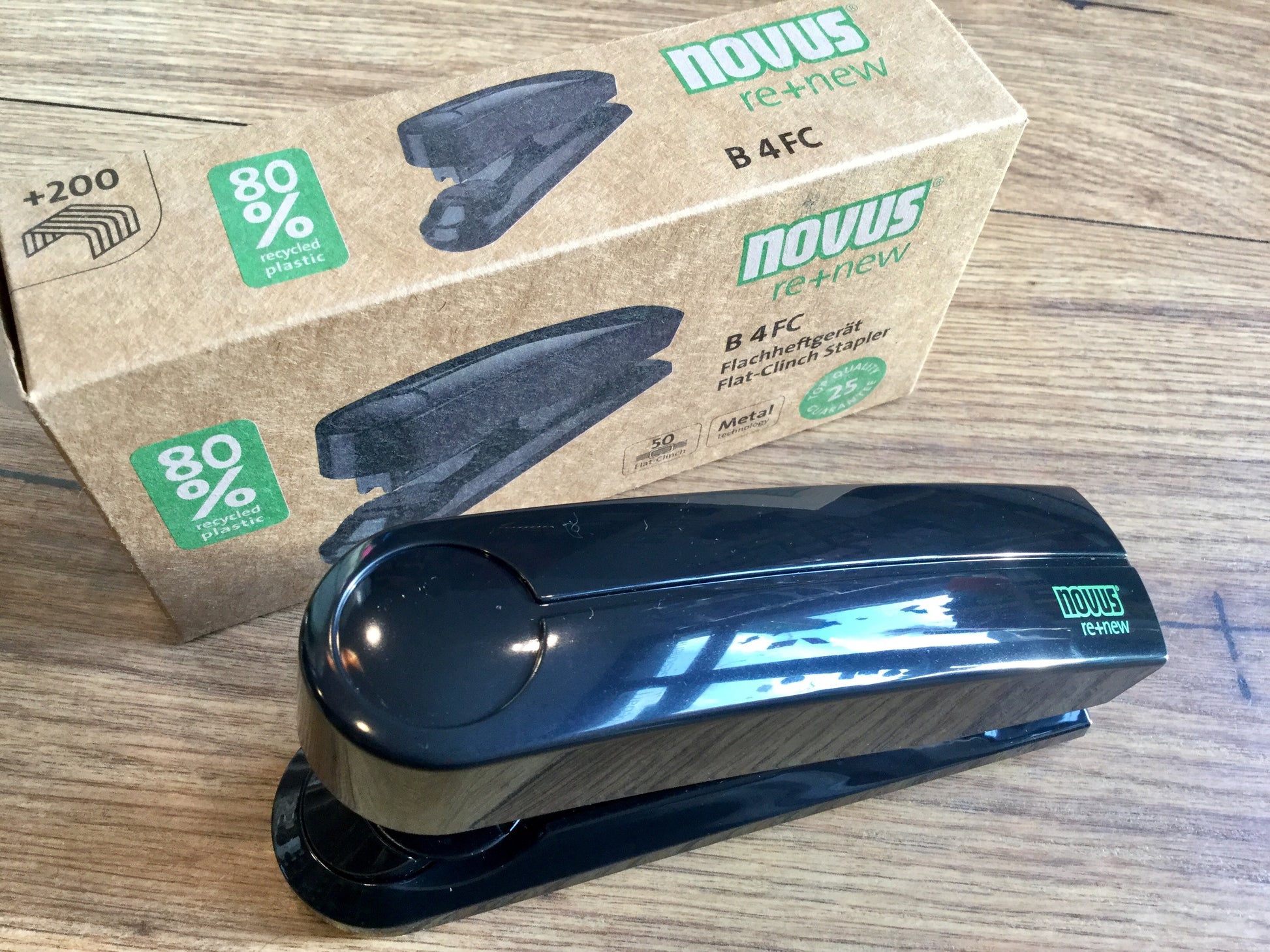 Ein sehr flach heftender Tacker aus Metall und Recyclingkunststoff von Novus.