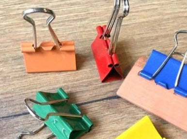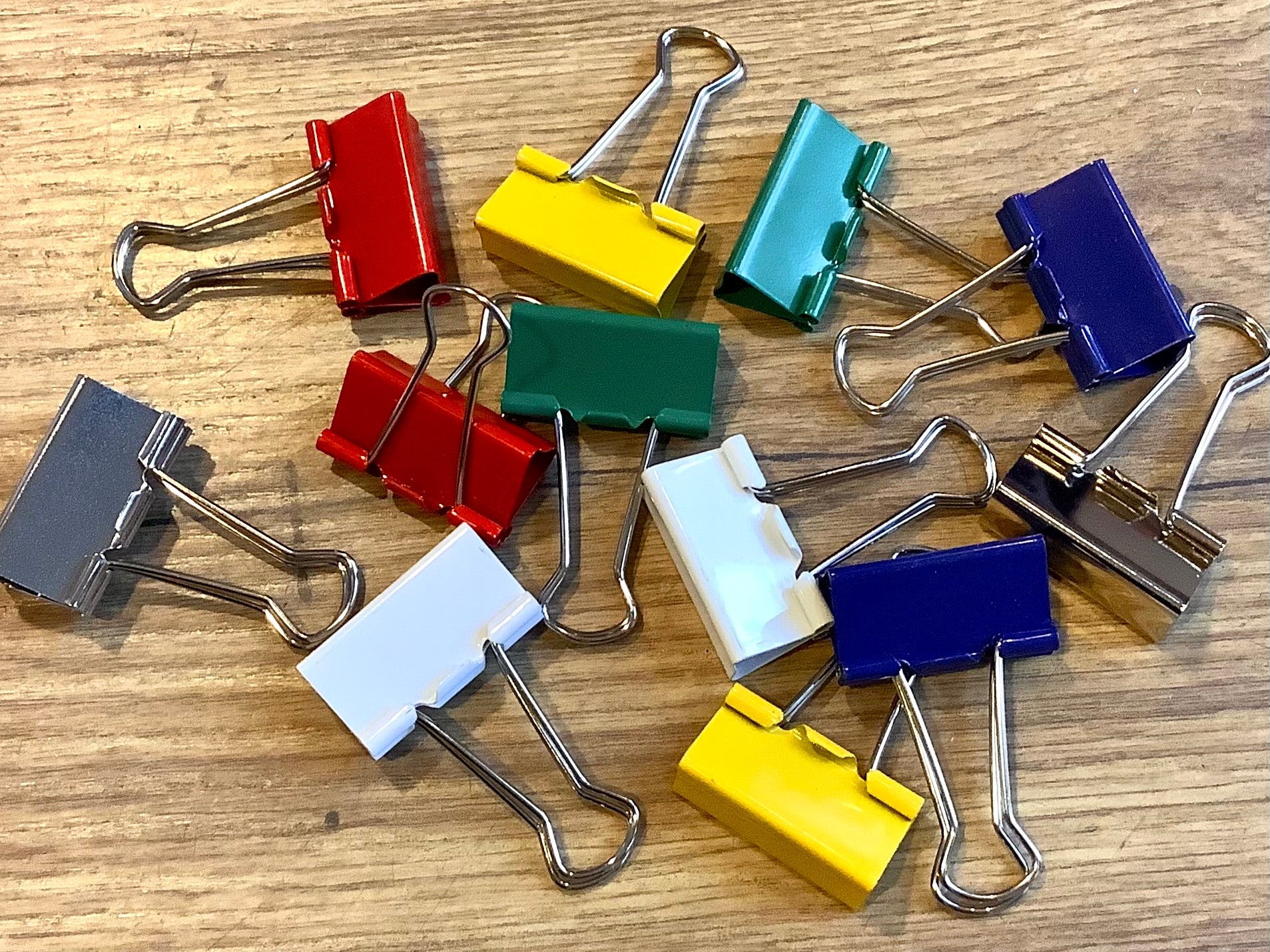 12 Foldback-Klammern aus Metall in einer Pappschachtel (farbsortiert)