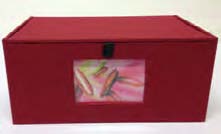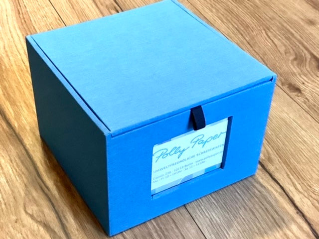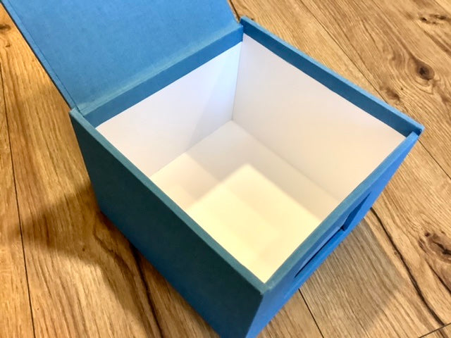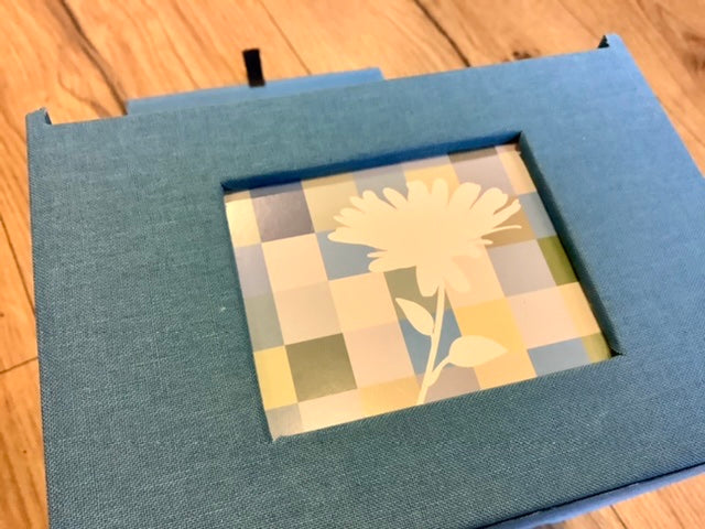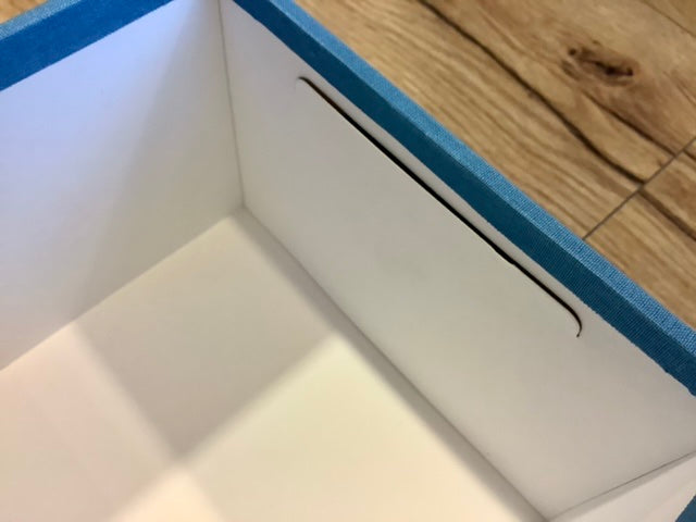 Leinenbezogene Fotobox "Lino" mit Wechselrahmen an der Vorderseite.