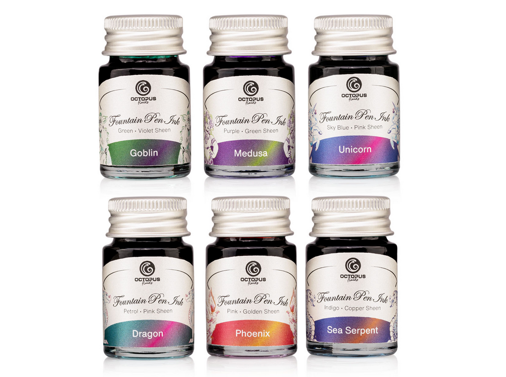 Mach Dich bereit für ein nahezu magisches Schreiberlebnis! Die Octopus Fluids Sheen Ink Kollektion bietet Dir ein Sortiment von zauberhaften Tinten mit einem ganz besonderen Zwei-Farben-Effekt. Jede Tinte ist von einem mythischen Wesen inspiriert, sei es das märchenhafte Einhorn, der Drache oder die Meerjungfrau. Die Farben dieser Tinten sind ebenso magisch wie ihre Namen: Ihr Schriftbild verändert sich je nach Blickwinkel und verwendetem Papier. Ein metallischer Glanz in Nuancen wie Kupfer, Gold oder Pink legt sich über die Grundfarbe der Tinte und schafft so eine visuelle Symphonie von Farben.
