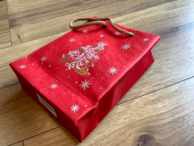 Festliche Weihnachtstasche / Geschenktasche / Tragetasche aus handgeschöpftem dicken Nepal-Papier mit Tragekordeln.