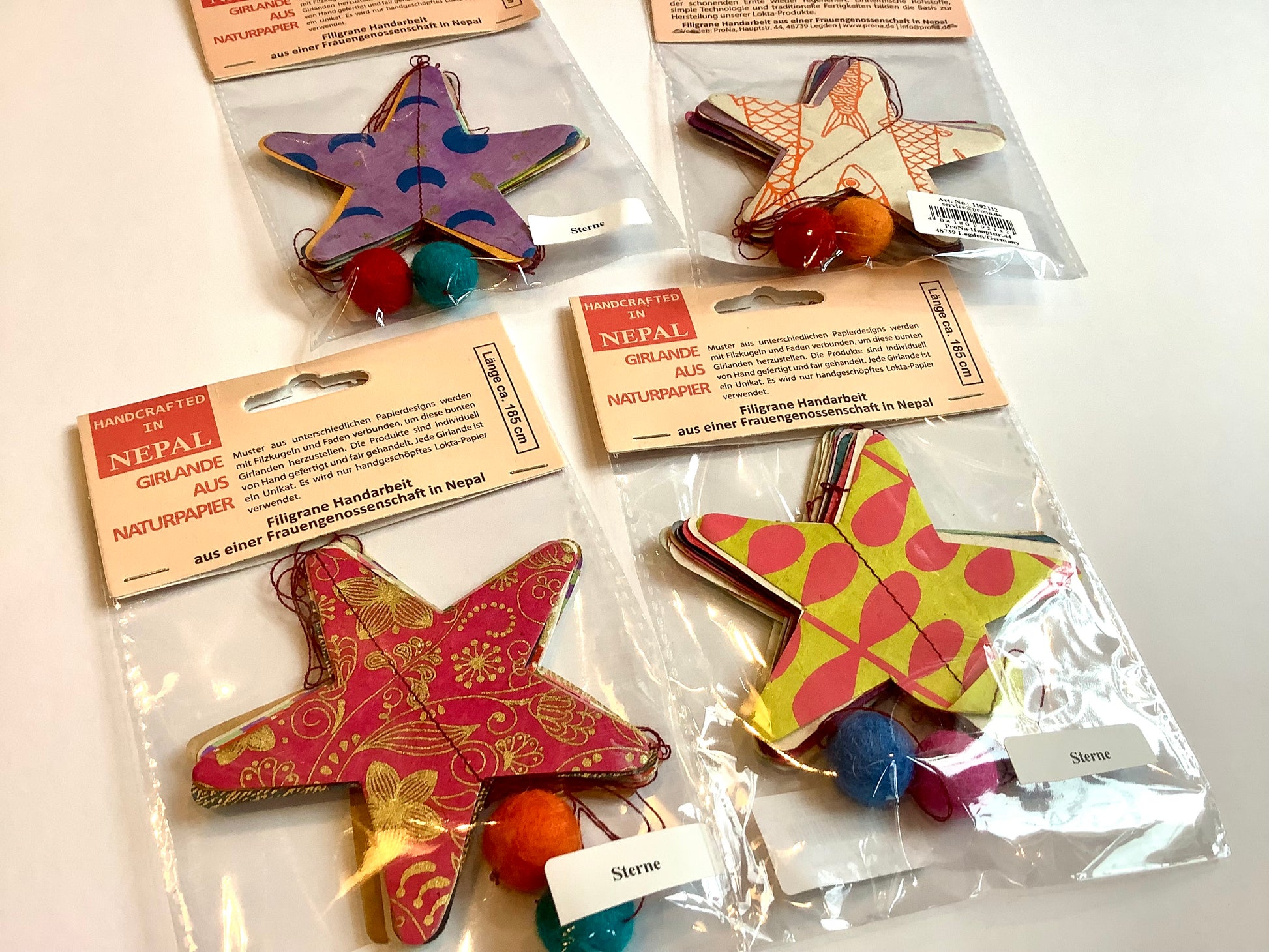 Frauen in Nepal stellen diese Girlande aus handgeschöpftem Nepalokta-Papier von Hand her.