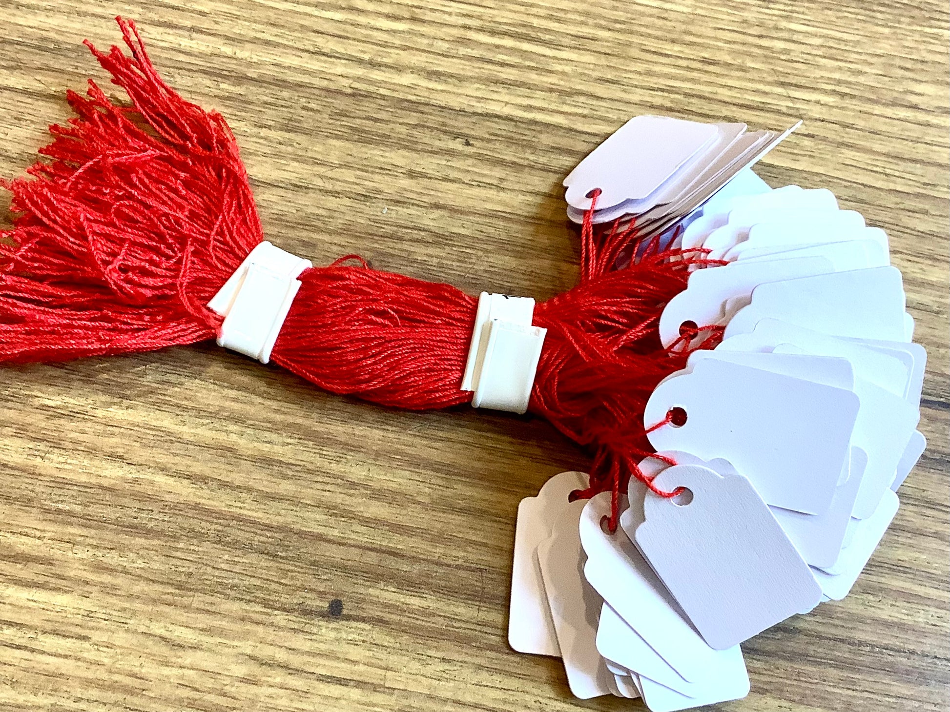 100 Hängeetiketten aus Papier mit rotem Bändchen - für die Preisauszeichnung oder auch als Mini-Geschenkanhänger.