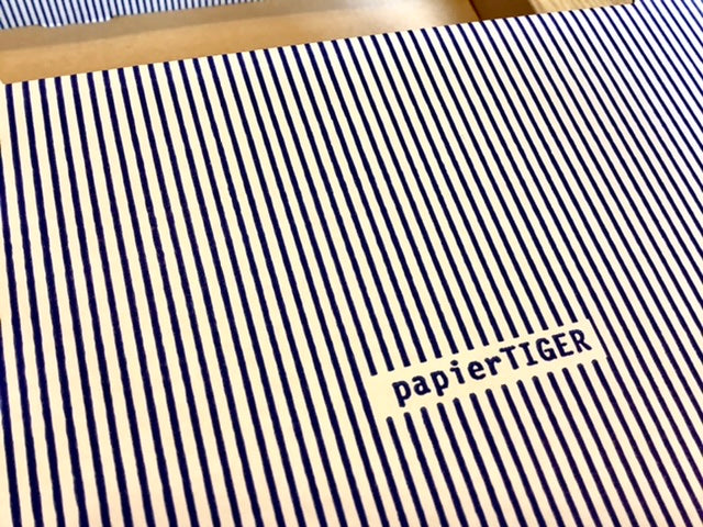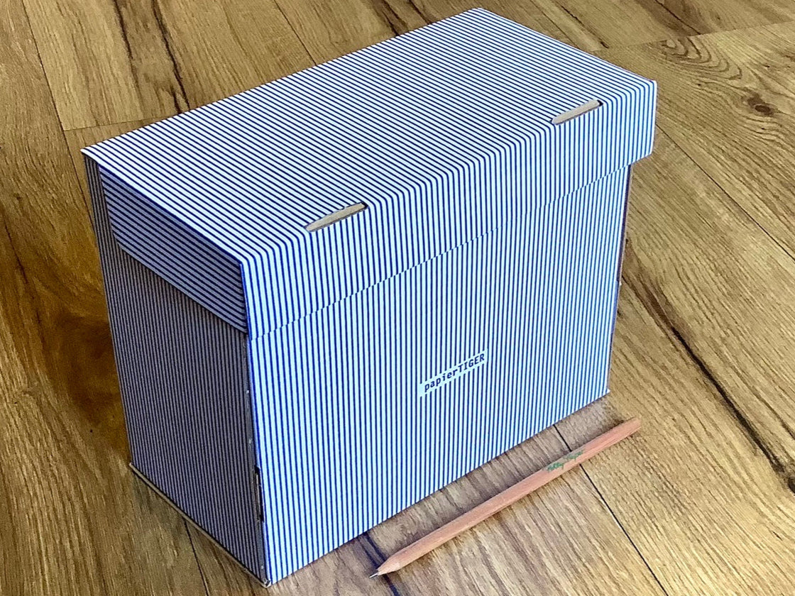 Papp-Box mit Aufklapp-Deckel im Nadelstreifen-Design zum Beispiel für Karteikarten. Superleicht und damit praktisch für unterwegs.