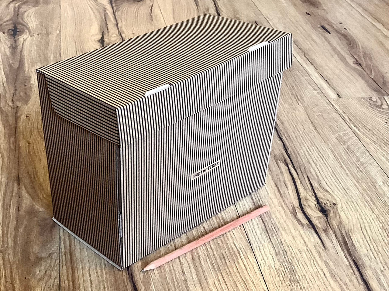 Papp-Box mit aufklappbarem Deckel im Nadelstreifen-Design zum Beispiel für Karteikarten. Superleicht und damit praktisch für unterwegs.