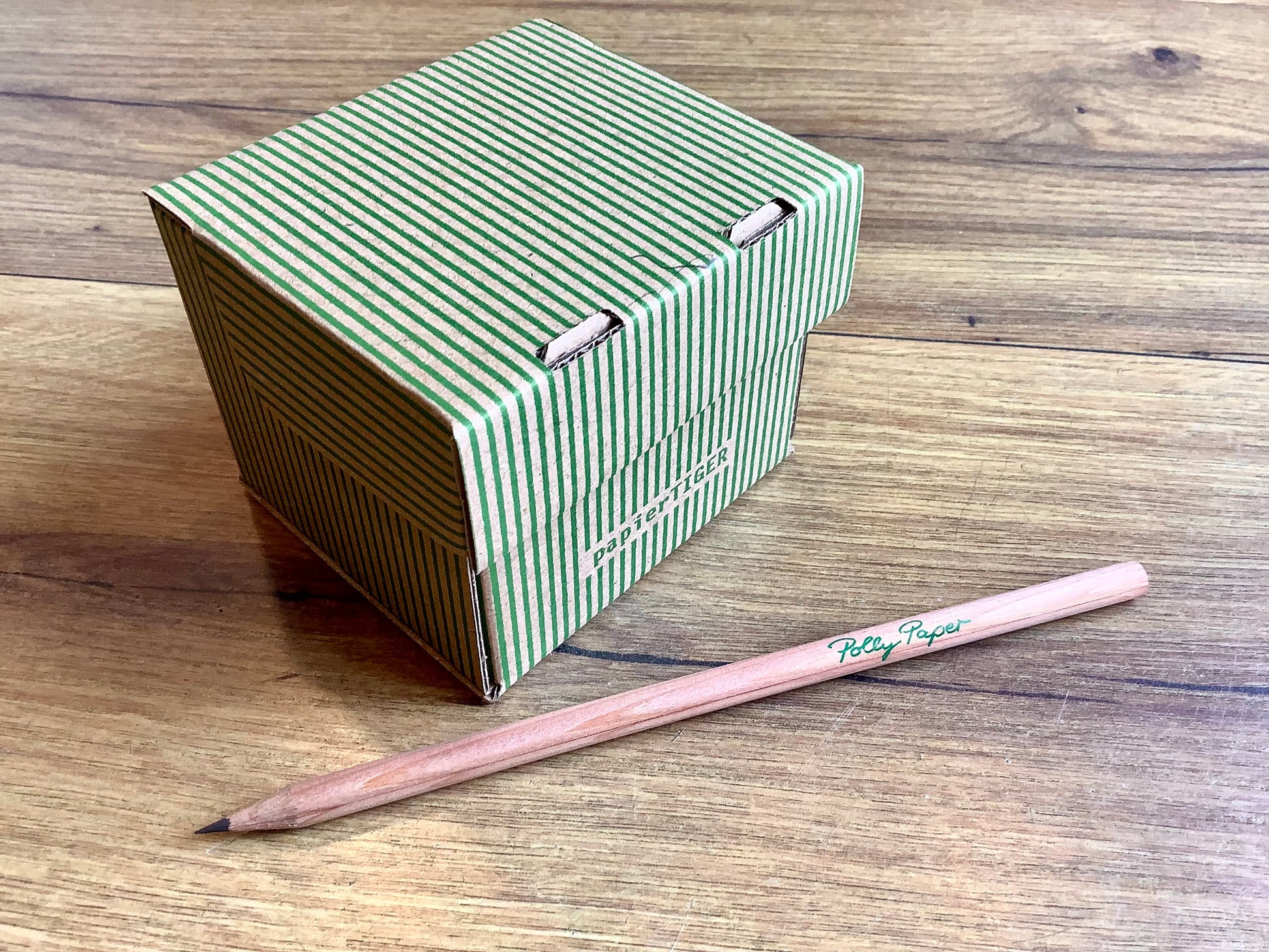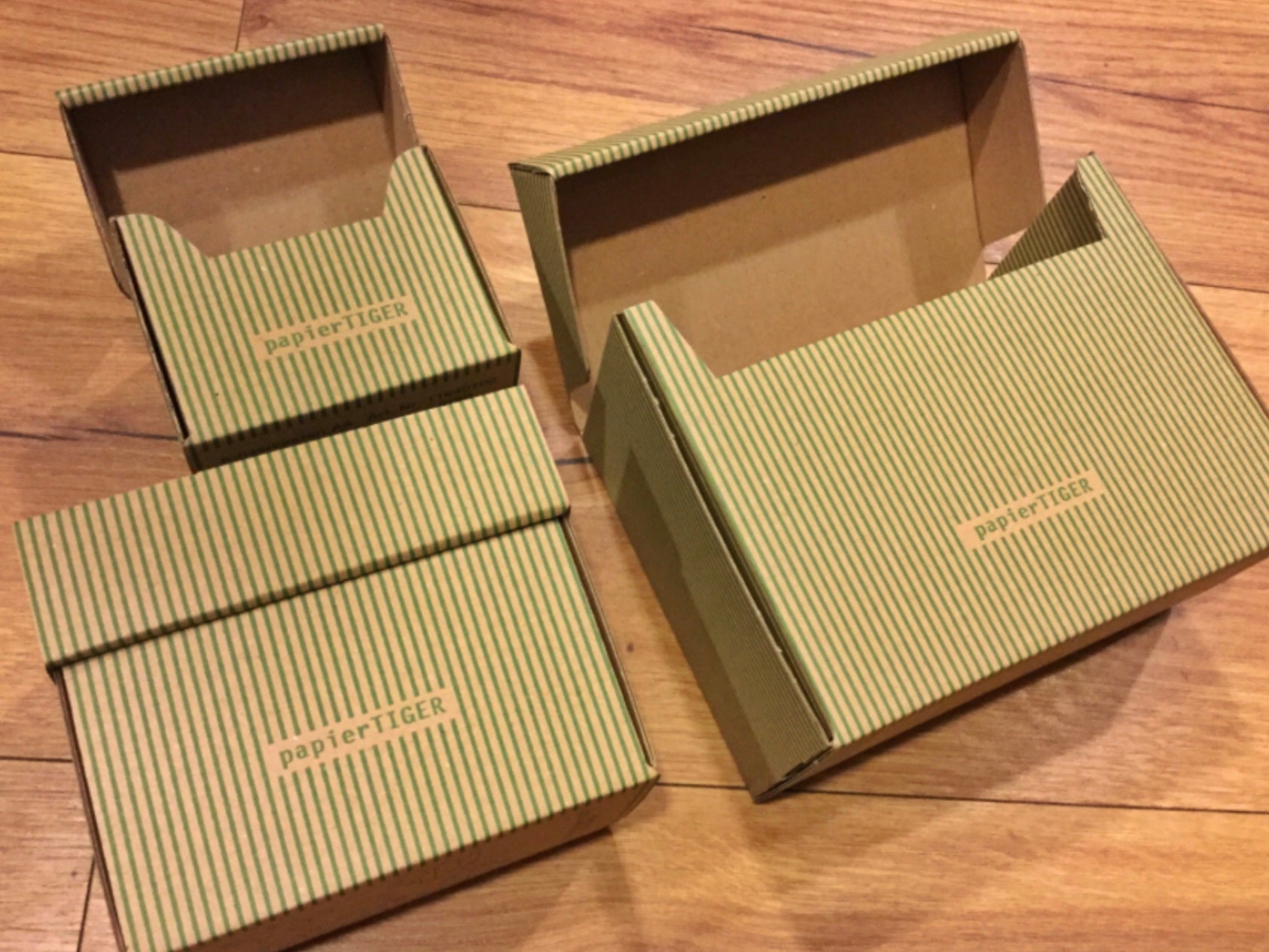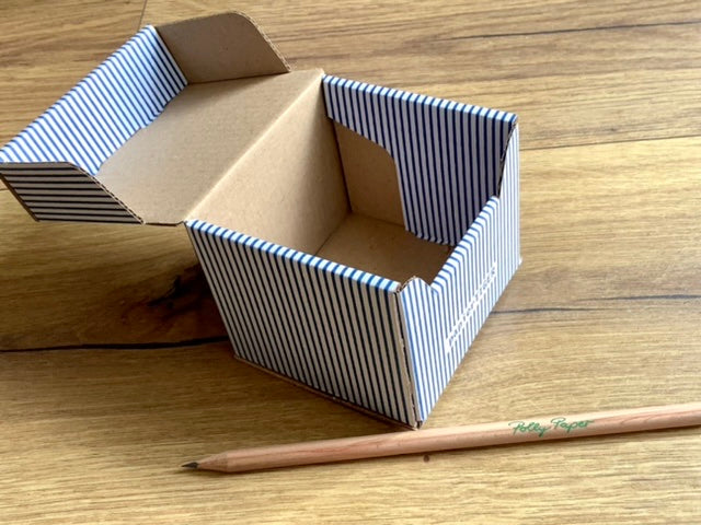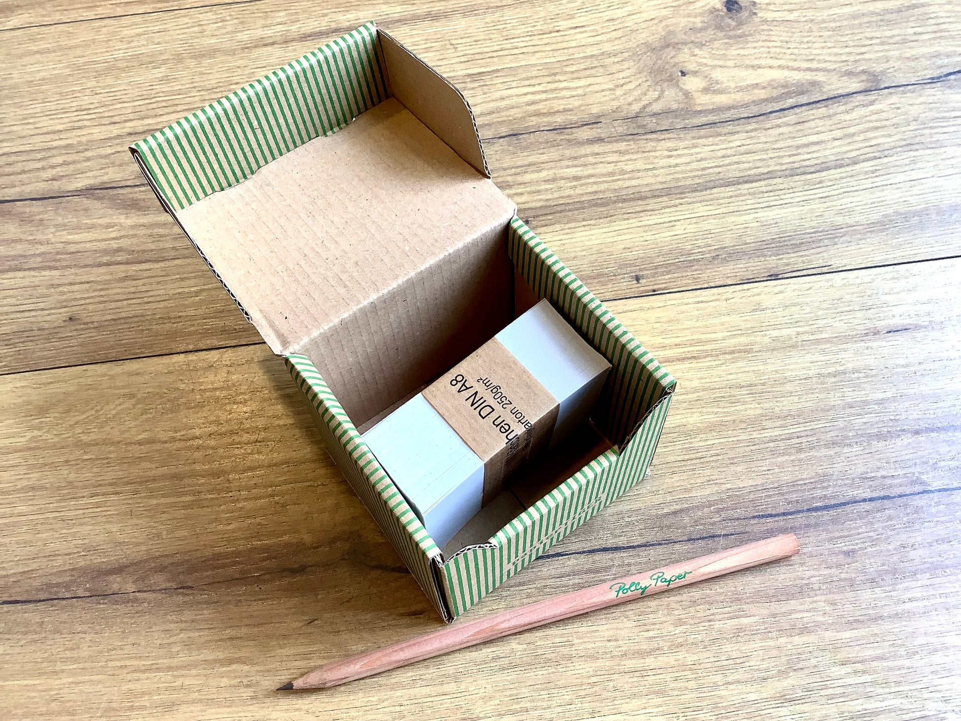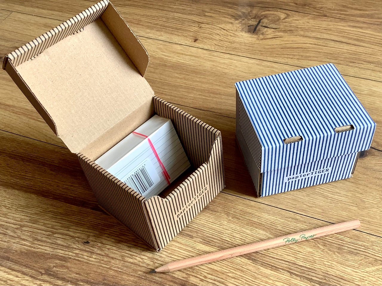 Papp-Box mit Aufklapp-Deckel im Nadelstreifen-Design zum Beispiel für A8-Karteikarten. Superleicht und damit praktisch für unterwegs.