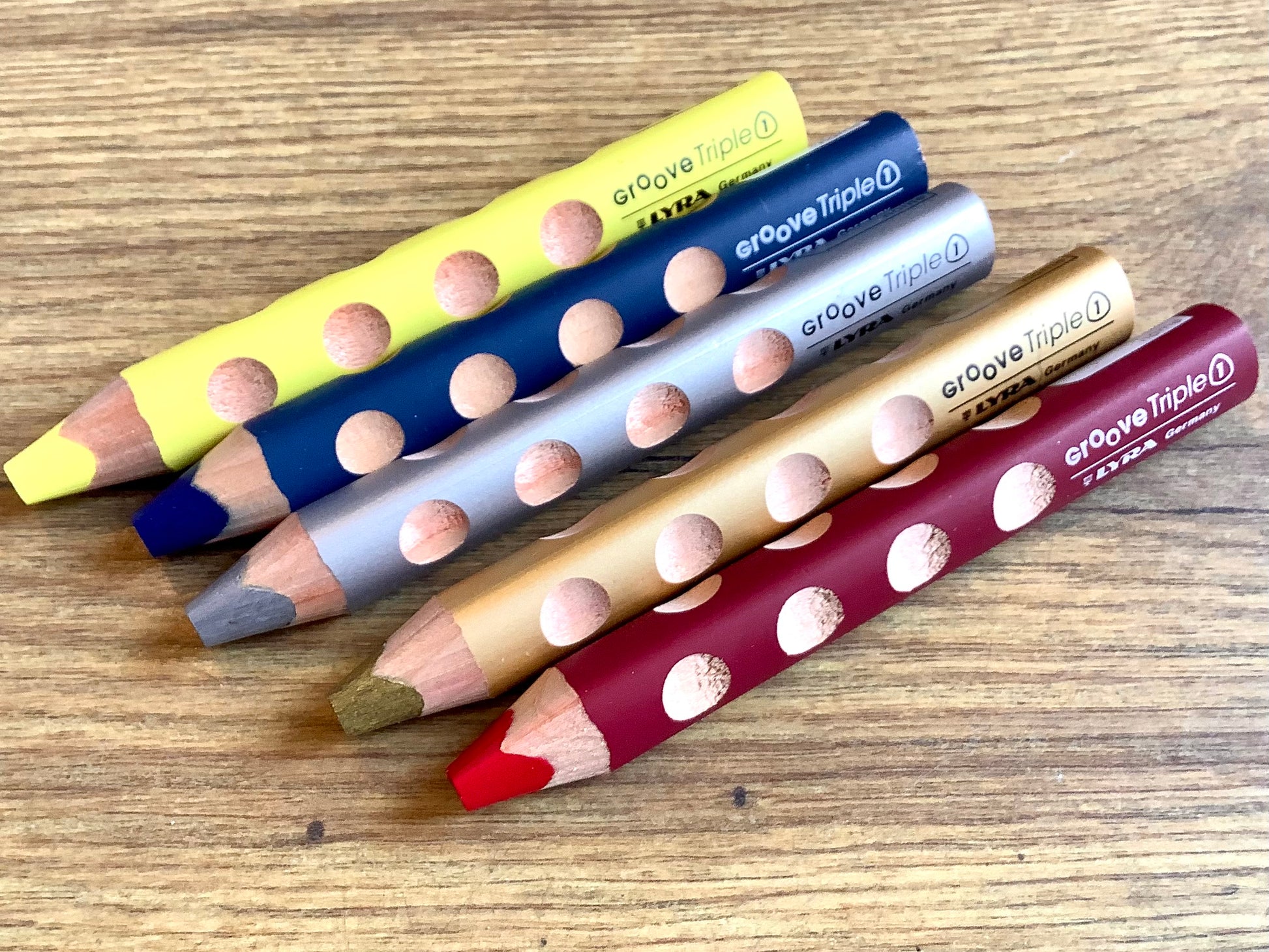 - die Griffmulden im dreiflächigen Holzstift wurden versetzt eingearbeitet, damit jeder Finger seine korrekte Position einnimmt. Da Kinder die vertieften Stellen im Holz besonders interessant finden, nehmen die Hände wie von selbst die perfekte Stifthaltung ein