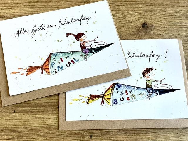 Kleine Klappkarte mit braunem Kuvert zum Schulstart - von der Berliner Illustratorin Inka Erichsen entworfen und extra für Polly Paper auf Recyclingpapier gedruckt.