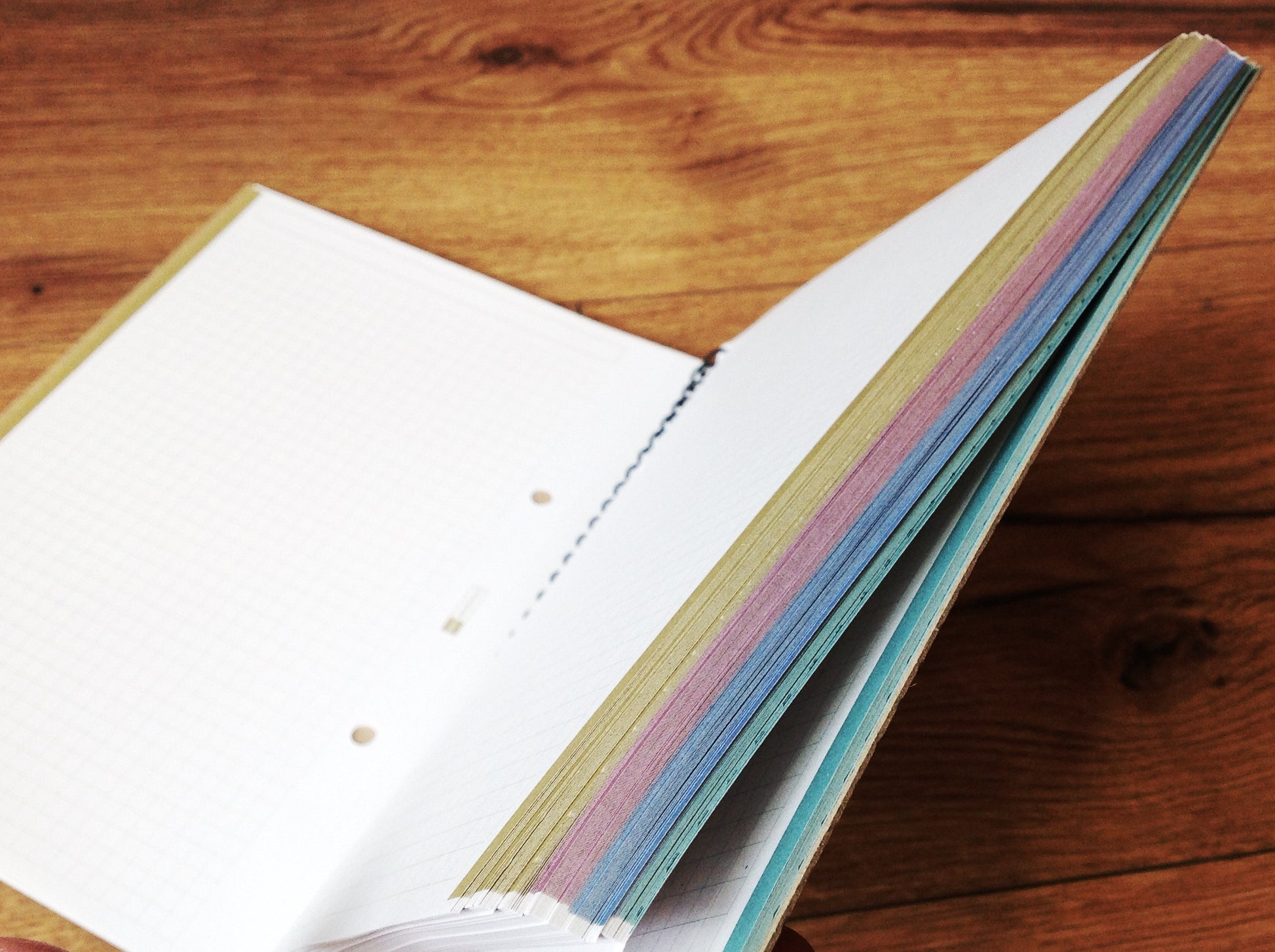 Durch den farbigen Rand entsteht eine Art Register, je 30 Seiten in einer Farbe - sehr praktisch für Mitschriften in verschiedenen Fächern zum Beispiel (Schule oder Uni).