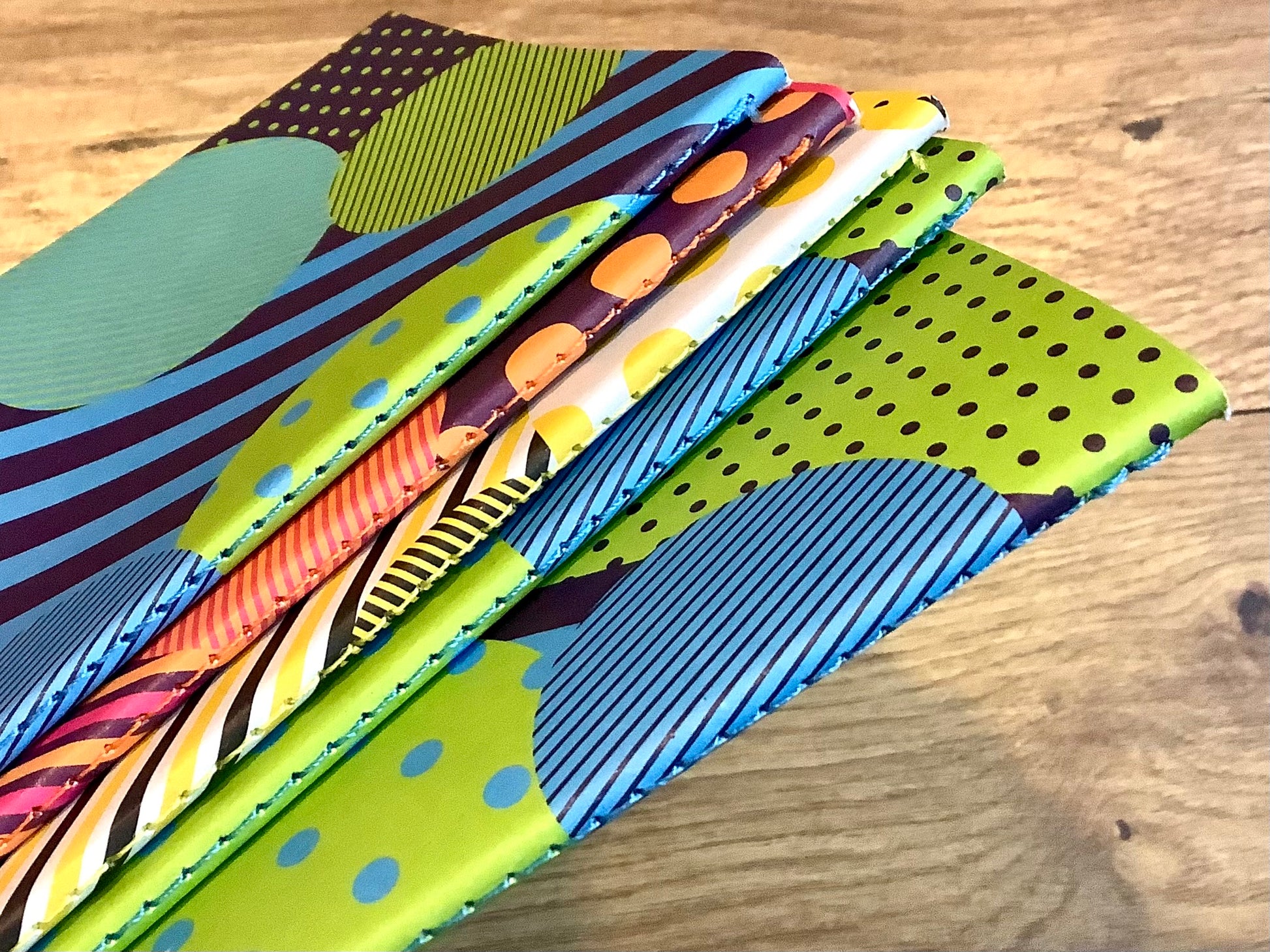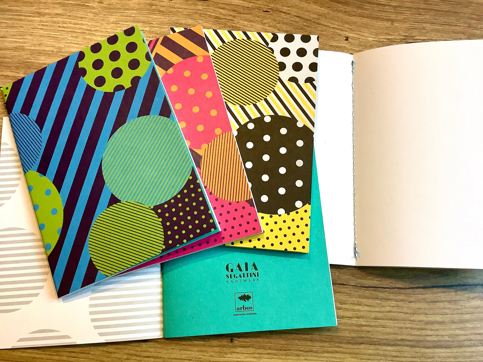 Das bringt Farbe in den Alltag: Kleines genähtes Notizheft aus Recyclingpapier in knalligen Farben von arbos - Italian Eco Design aus Sologna in Kooperation mit Gaia Segattini Knotwear.