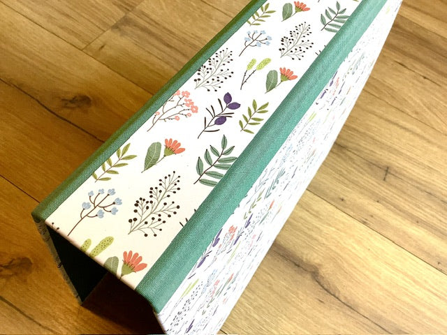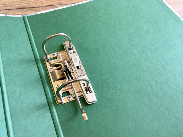 Edel kaschierter Hebel-Ordner mit türkisgrünen Leinenkanten. Fast zu schade für normale Unterlagen - man kann ihn aber zum Beispiel gut als Fotoalbum benutzen: einfach gelochte Fotokartonblätter einlegen.