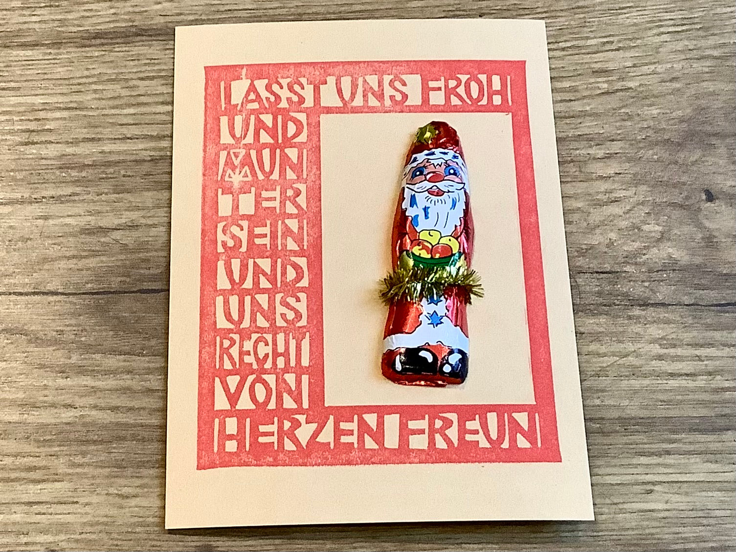 Gestempelt auf hellbraunes (ockergelben) Karton (300 g/qm) von Japun (fördert Aufforstungsprogramme).