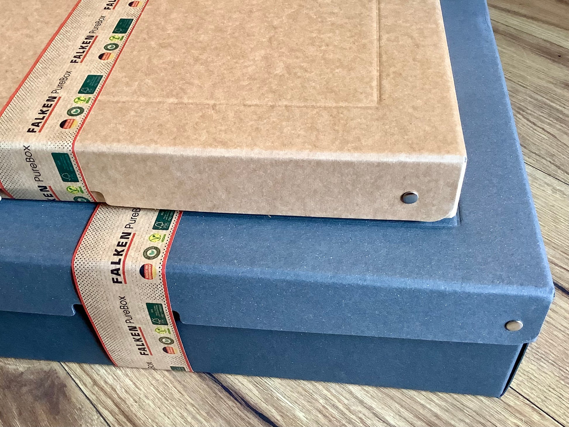 PURE Box - Schachtel bestehend aus Box und Deckel, mit klassischen Look aus schwarzer hochwertiger Pappe, sehr hohe Stabilität, genietet, Griffaussparung, Beschriftungsfeld, puristisch, ohne Plastik, ohne Folie, FSC®, Vegan und Blauer Engel zertifiziert - Made in Germany
