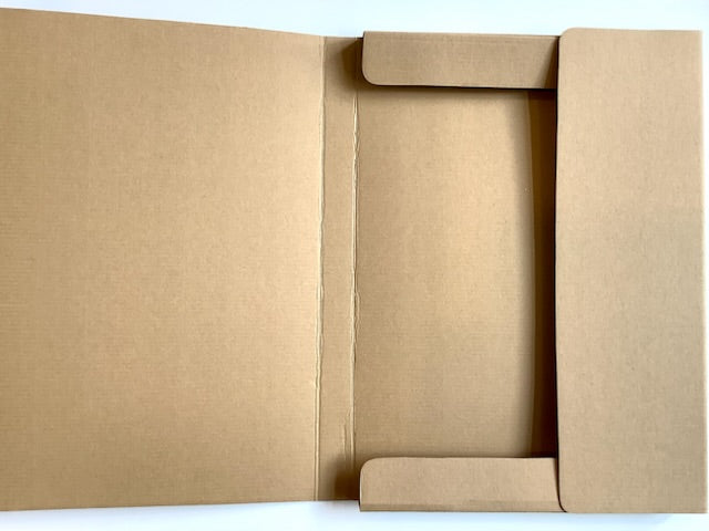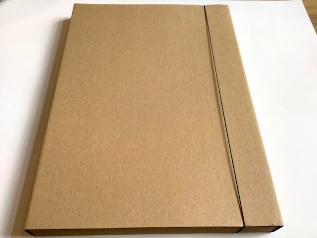 Einfache naturbraune Sammelbox mit 3 Einschlagklappen zur Aufbewahrung loser Papiere. Die Mappe schließt mit einem Gummiband. Für Schule und Arbeitsplatz.