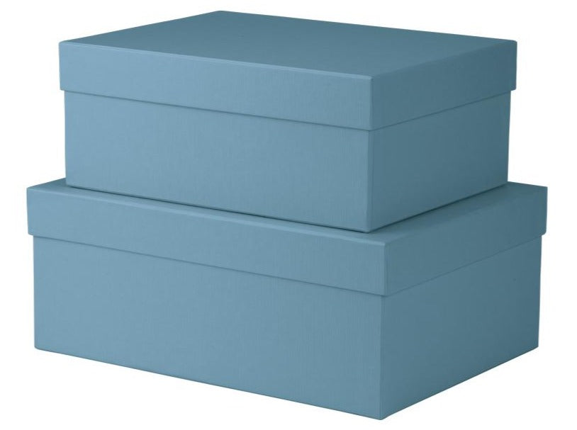 Rechteckige Schachteln in einem edlen Denimblau (blaugrau) mit Deckel von Rössler Papier (NRW).