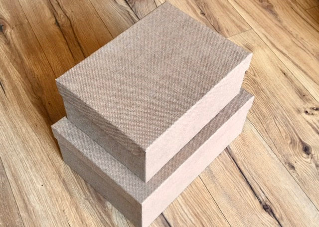 - Materialien: Pappkern mit Papier und dem sisalartigen Hazelnut-Papier kaschiert, Kleber