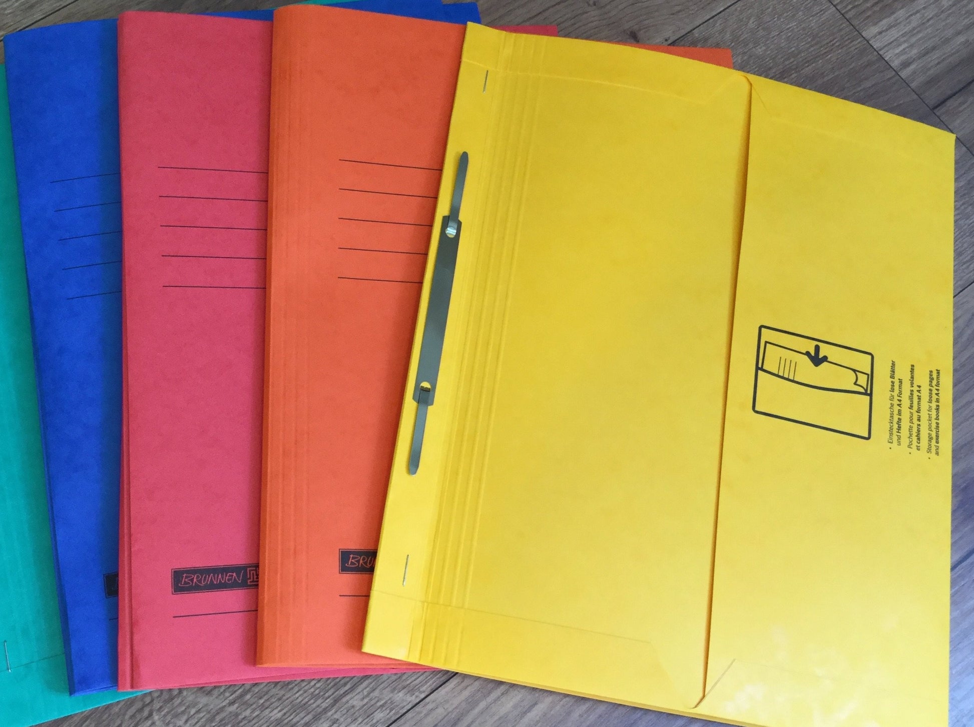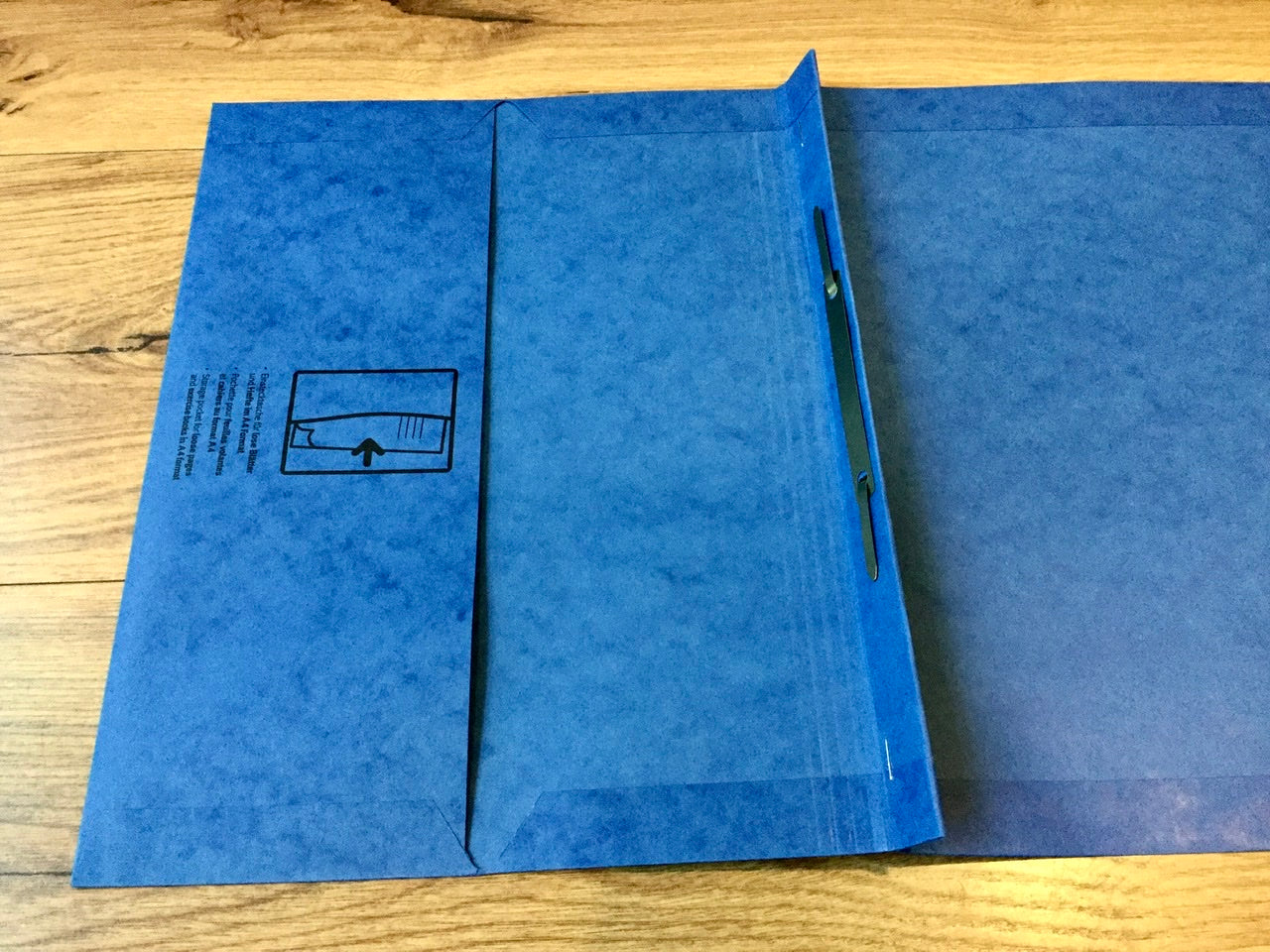 Stabiler Schnellhefter aus Manilakarton mit Einsteckfach hinten.