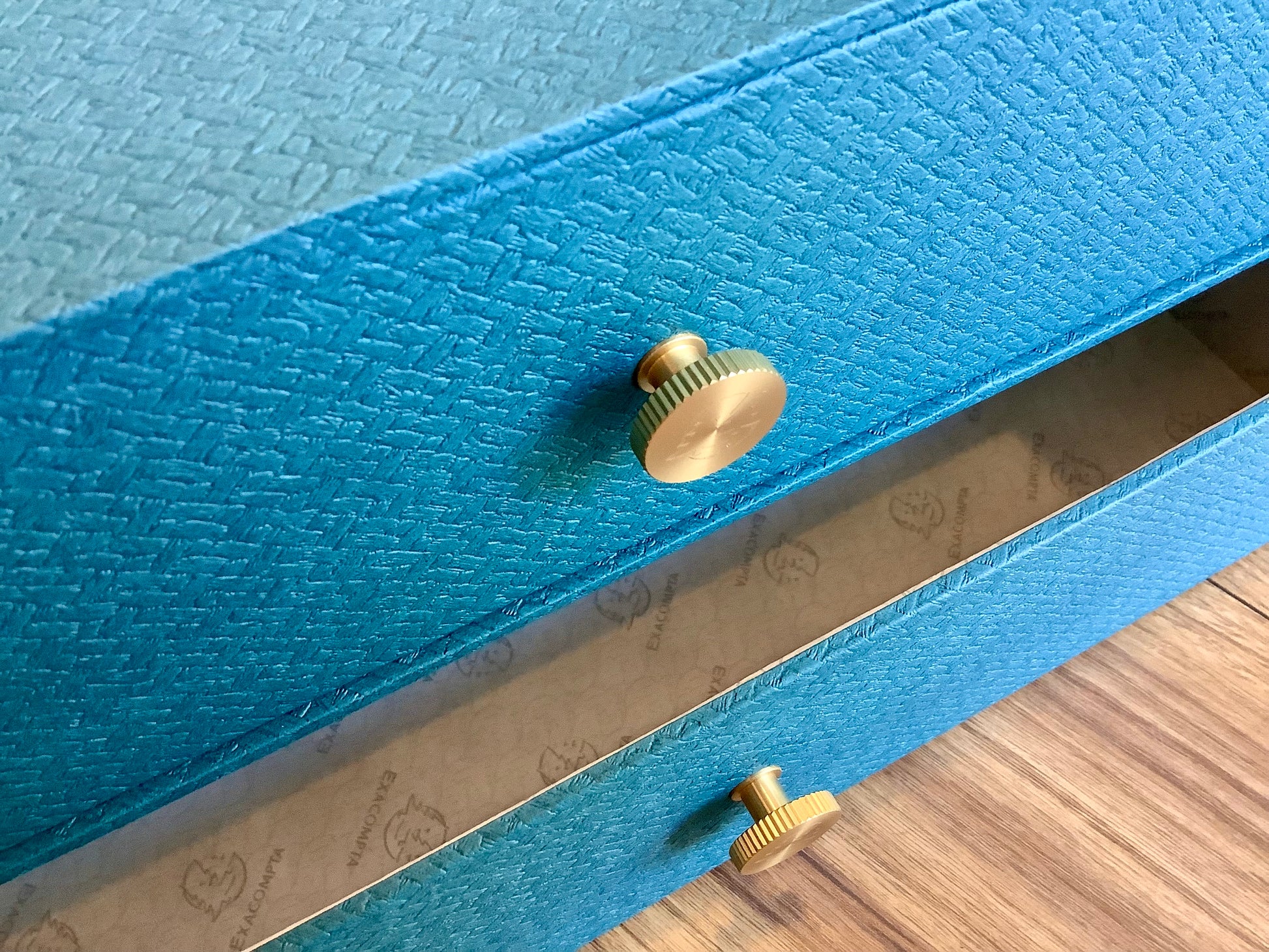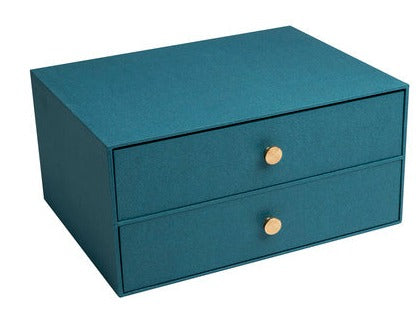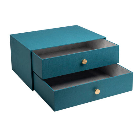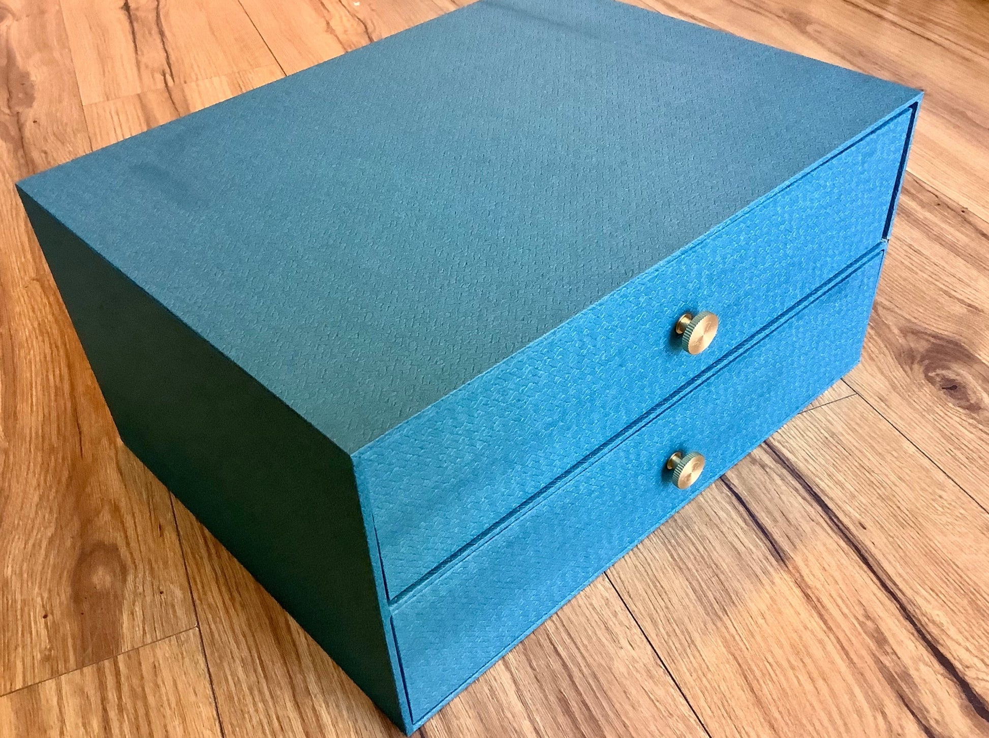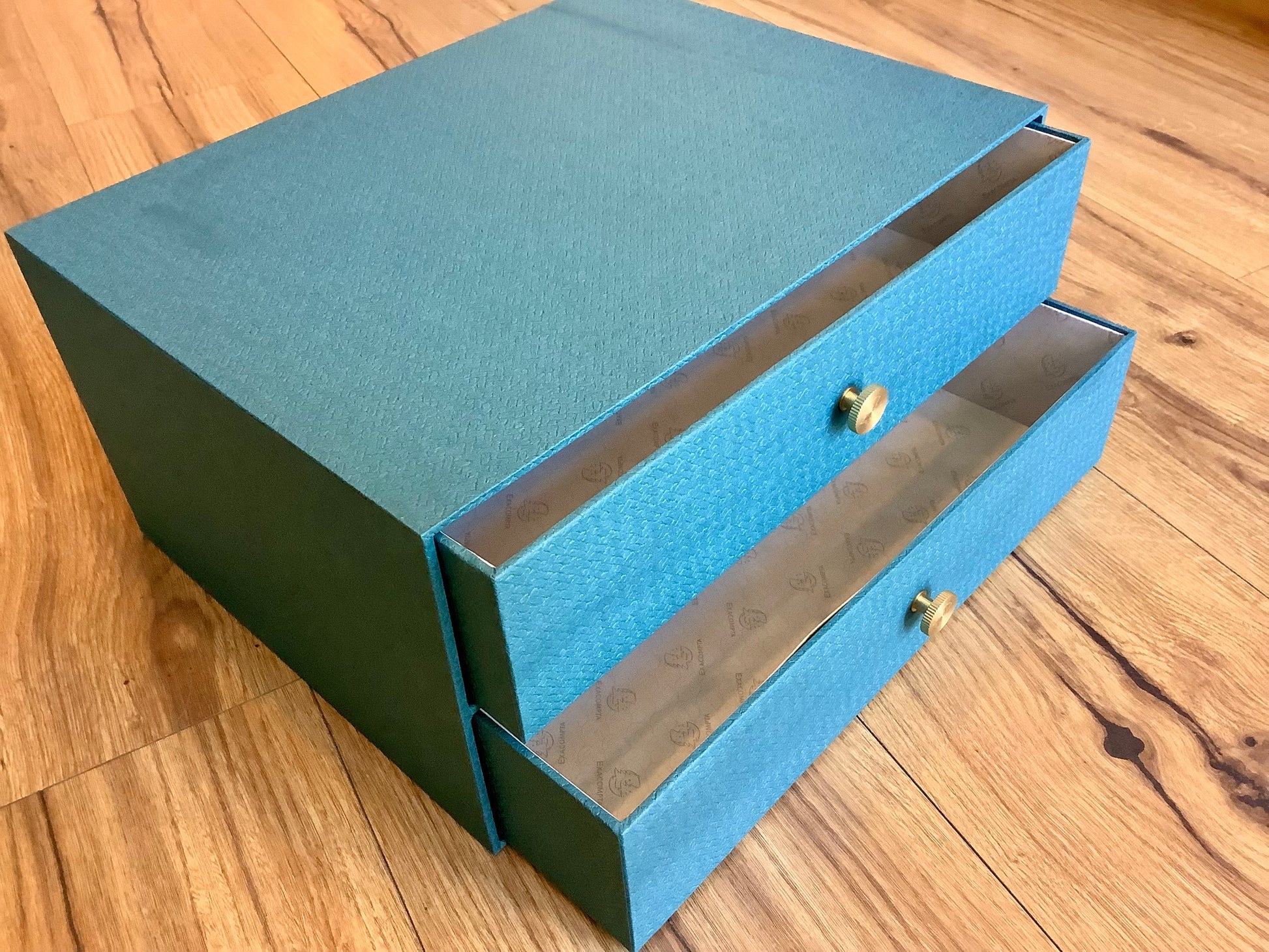 Stabile Schubladenbox aus kaschiertem Karton in einem edlen Blaugrün - eine schöne und umweltfreundliche Alternative zu Modellen aus Kunststoff.