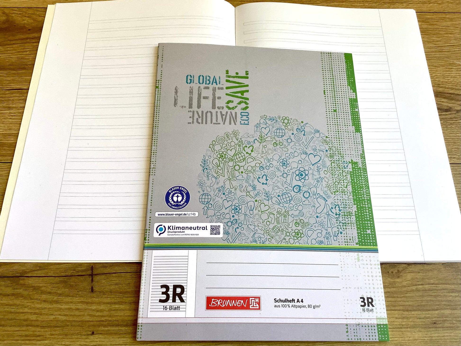 Umweltfreundliches Schreibheft fürs 3. Schuljahr, Lineatur 3R (Schlauchlinien mit Korrekturrand).