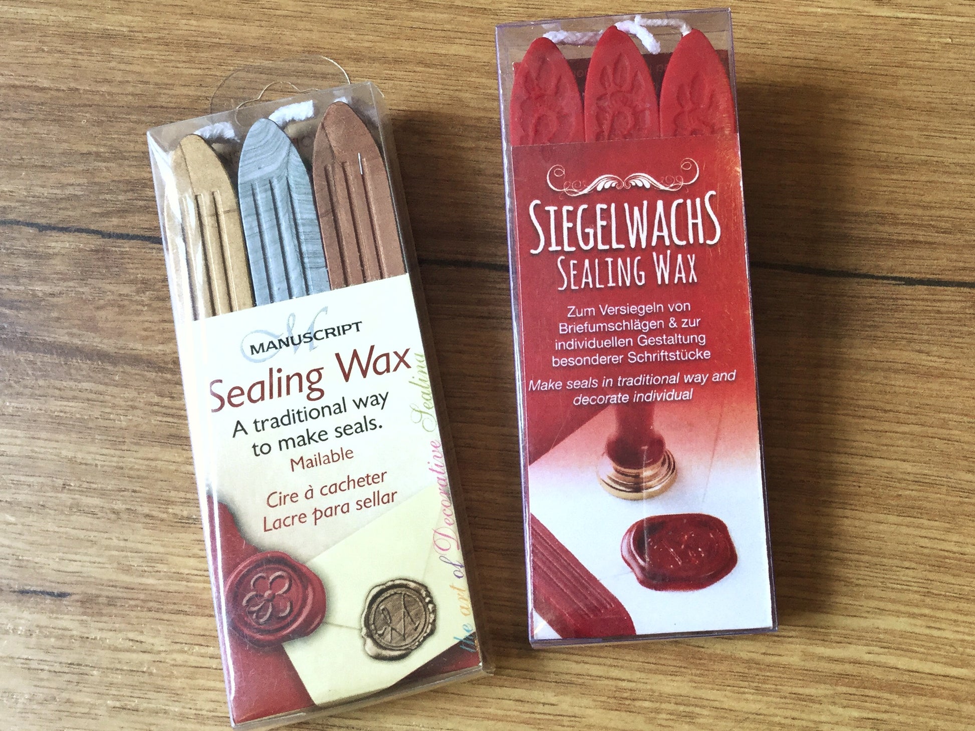 Drei Stangen Siegelwachs in der klassischen Siegelfarbe rot oder in gold/silber und kupfer.