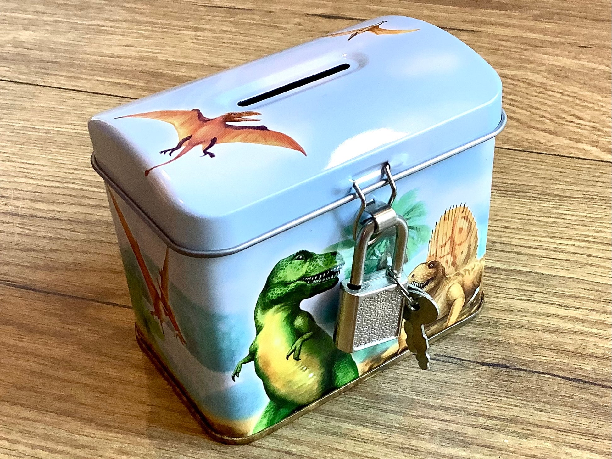 Spardose aus stabilem Metall mit dem Dinosaurier-Motiv T-Rex