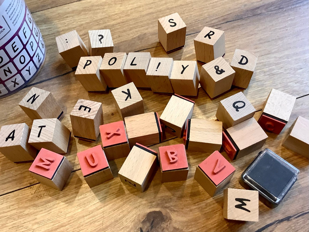 Neben den 26 Buchstaben gibt es noch 4 Stempel für die Zeichen &, !, ? und :. Dazu ein kleines Stempelkissen in schwarz.